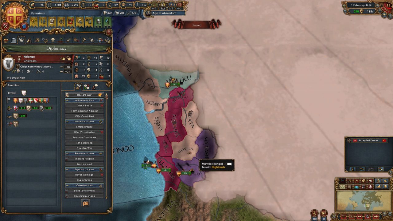 東アフリカのZanzibarトレードノードは入4出1のかなり優秀なトレードノードで、しかも下位ノードがビザンツが簡単に抑えられるCapeである以上少なくとも首都のCape Verdeが属するIvory Coast(入4出4)よりは資金回収がしやすいところなので、このあたりを征服してメインポートを移転し収入の増加を図ります。