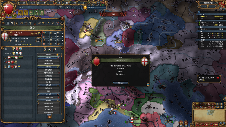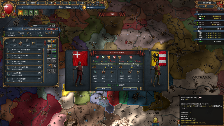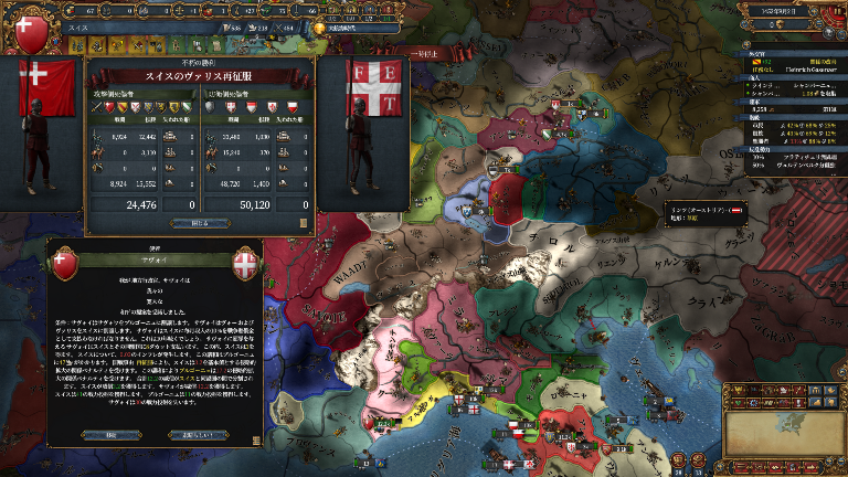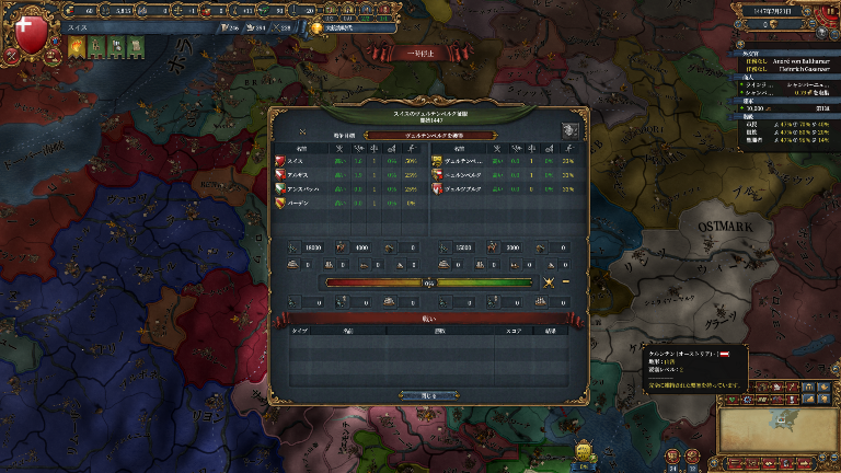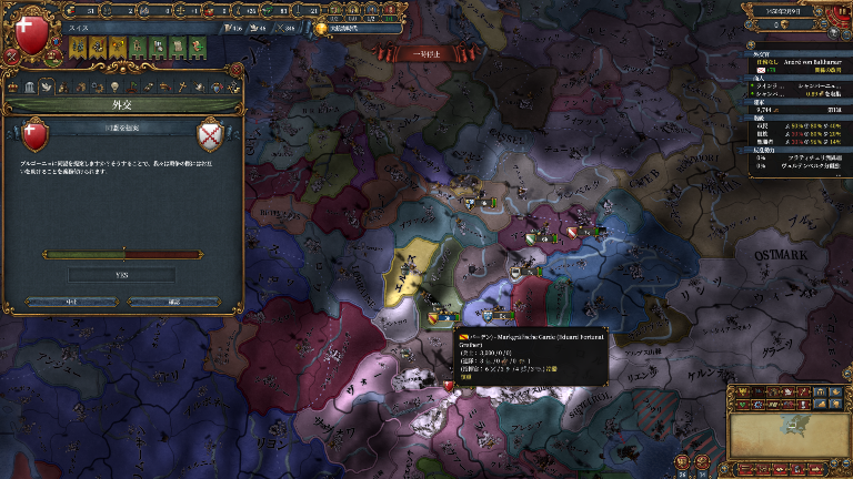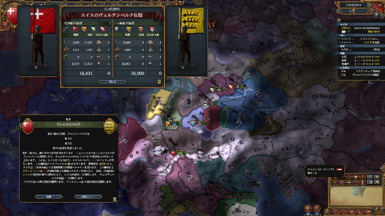 まあ味方にブルゴーニュと愉快な低地諸国がいる上アンスバッハも来るらしいのでスイスは占領しまくってればOK。