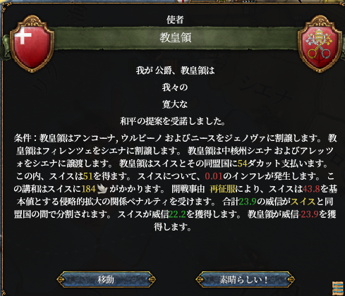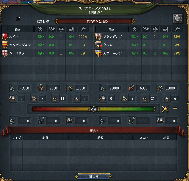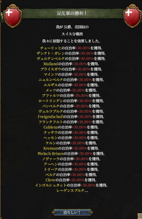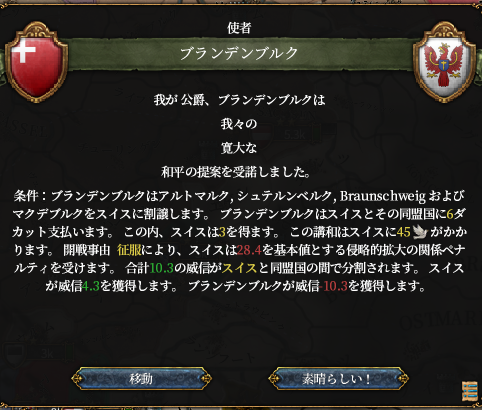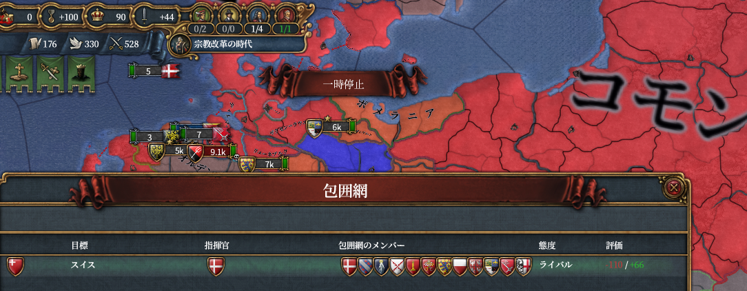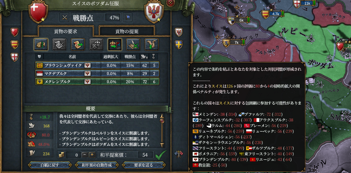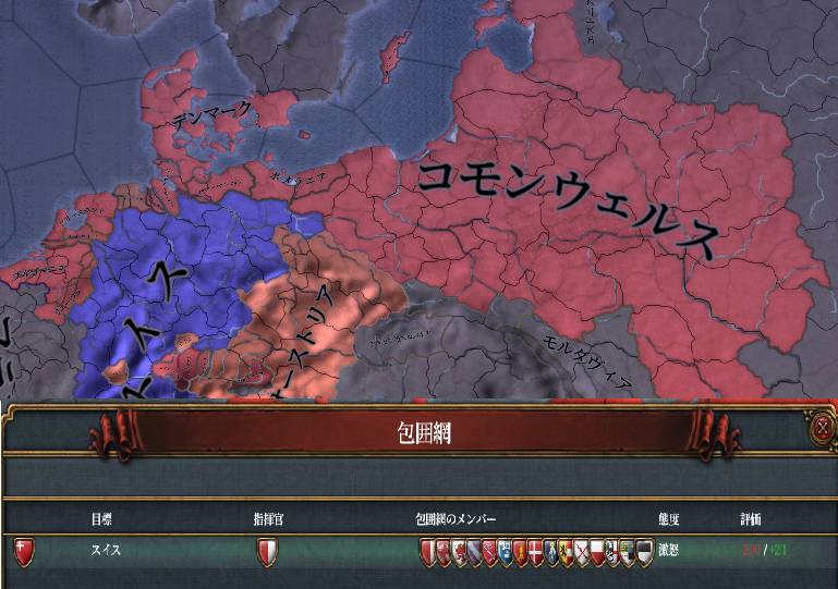 そして相次ぐスイスの侵略行為に遂にポーランド*1とデンマークが激怒、対スイス包囲網はバルト海からラインラント北部までを覆う大同盟帯へと成長してしまいます。