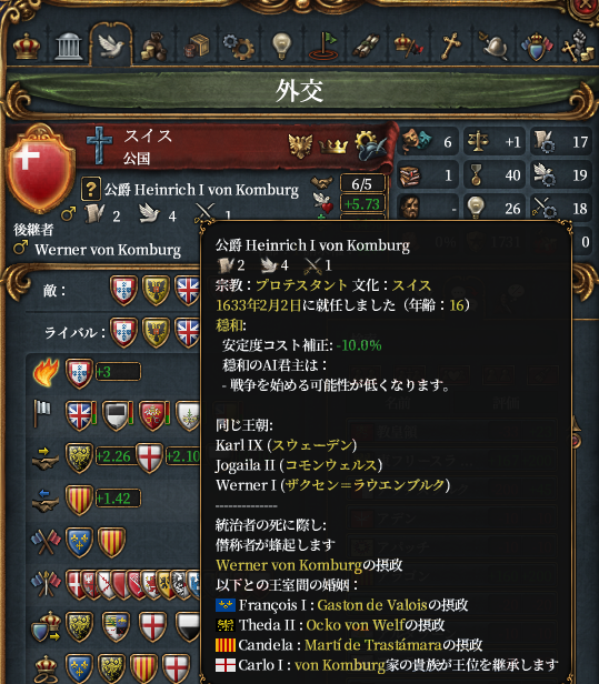 皇帝アラゴン!こいつはフランスと同盟しつつイベリアの大半と南イタリアを制している大国でスイスの同盟国です。しかしこうなってしまうと自由都市などに攻め込めにくくなってしまいますねぇ。