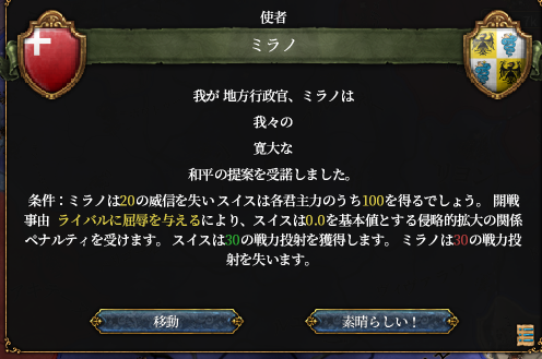 分離和平でプファルツ同盟網をぶっ壊し、ミラノはDEVが高すぎるので領土は取らずに和平しました。