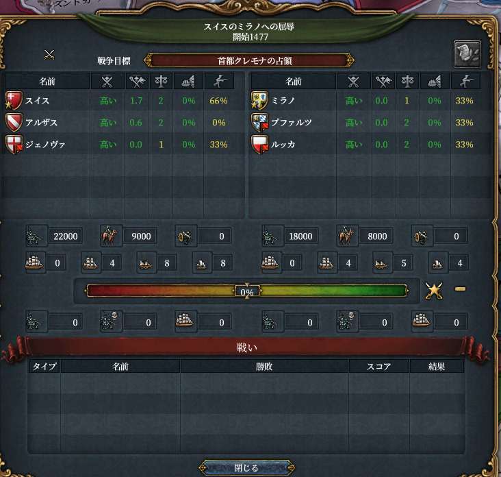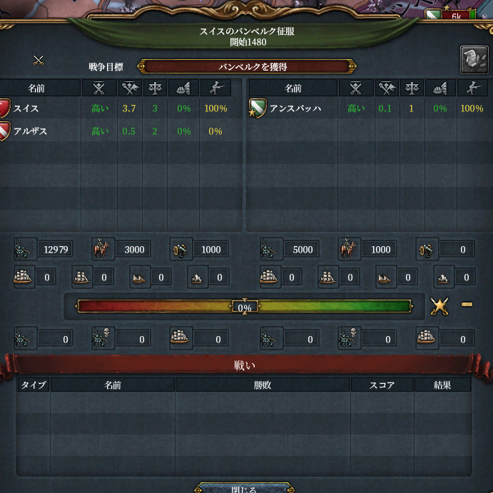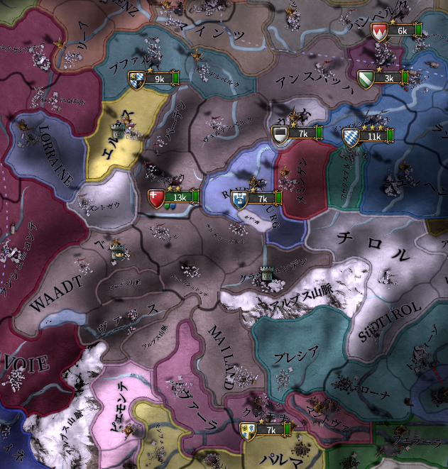 実際は敵の同盟国にラーフェンスブルクがいます。実はアンスバッハは昔スイスの同盟国だった時代に参戦の見返りとしてニュルンベルクをかっさらっていった*4経歴がある領土欲に塗れた邪悪な国家です。そしてニュルンベルクはラインラントノードの交易中心地。