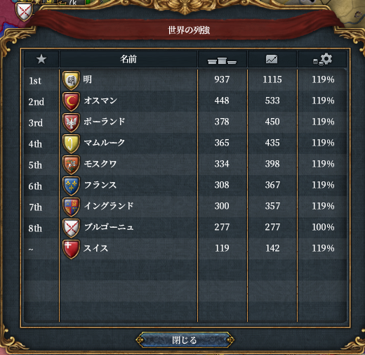 現在の列強。ブルゴーニュとデンマークが8位争いをしているようです。スイスも負けていられません。というわけで…