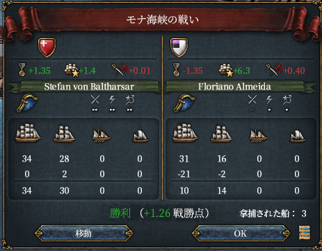 属国リエージュの大型船2と小型船1が合流、味方被害無しに対し敵大型船を4隻沈めた。勝ったな、風呂食ってくる。