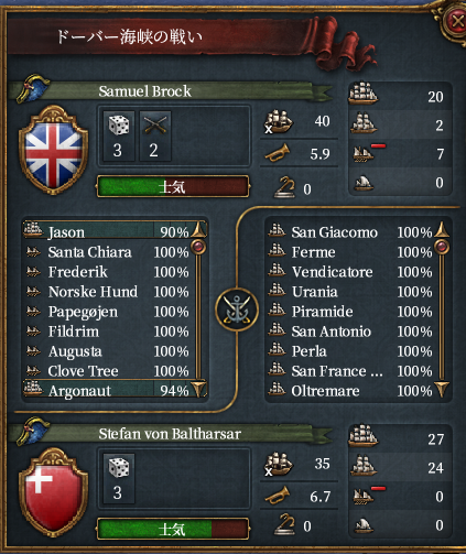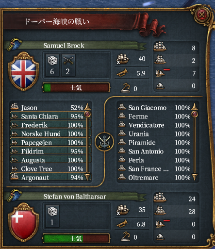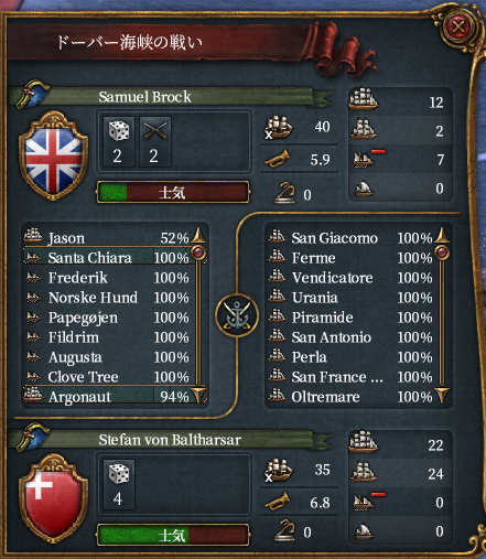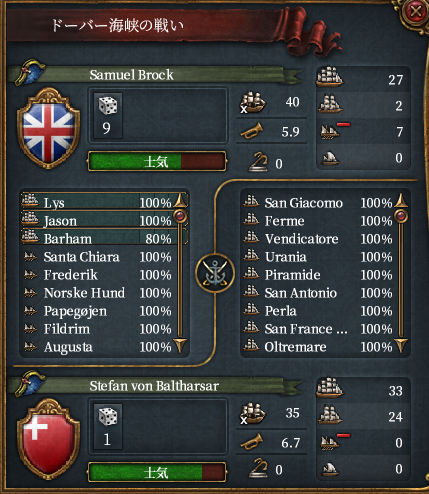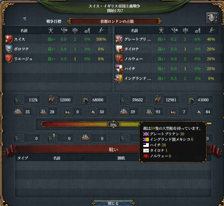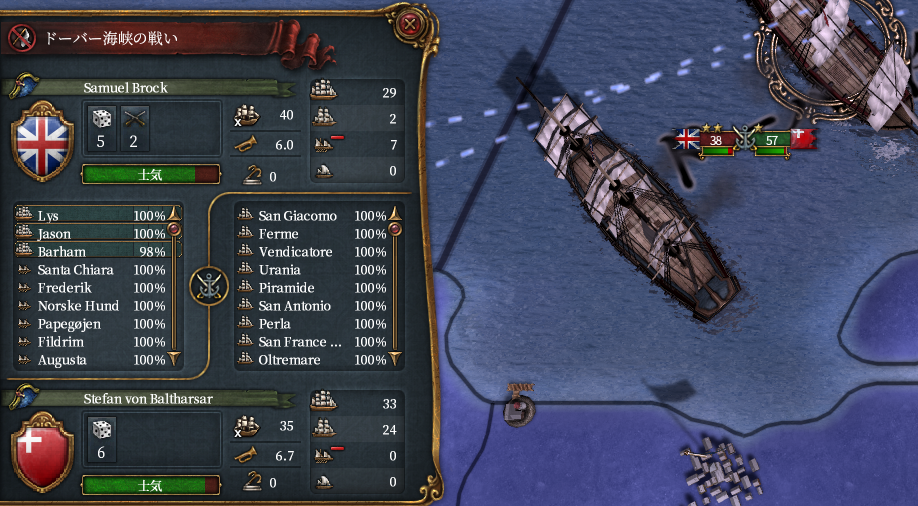 ところで、この世界のグレートブリテンは元気がなく、フランスに宣戦されてスコットランドを削るも巨大化したフランス+アラゴンが上陸してスコットランド領回復のパターンを数回繰り返していた(途中なんとかグレートブリテンになれた)。植民もメキシコ北部にかろうじて行っている程度で決して強国とはいえない。したがって大型船の数も30隻程度である。海軍軍質に勝る大量のスイスの大型船で叩き潰してもいいがそれだと質強化があまり見れないと思われたためあえて大型船33(+属国2)隻+小型船で挑むことにした。