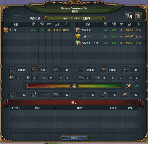 ローマは開始時点で戦争状態にあります。圧倒的な列強1位にも関わらずしょぼい戦力…
