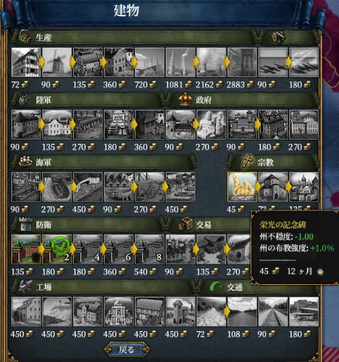 栄光の記念碑を建てて不穏度を下げていきます。