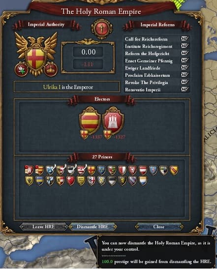 ローマ帝国を復活させるには消し去りたい神聖ローマ帝国ですが同盟関係などからなかなか全選帝侯をつり出せず無駄な時間を過ごしてしまいました(選帝侯になったMemmingenを無駄に同盟国にしたり)。