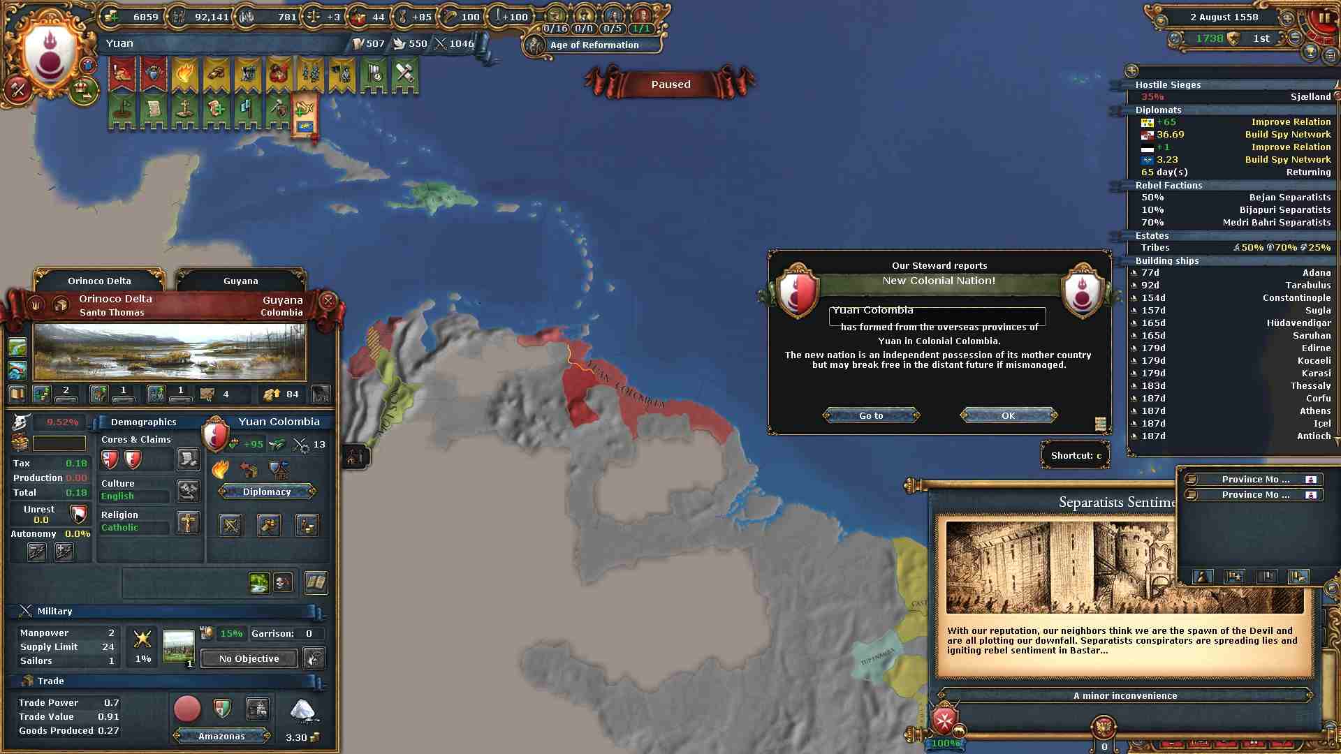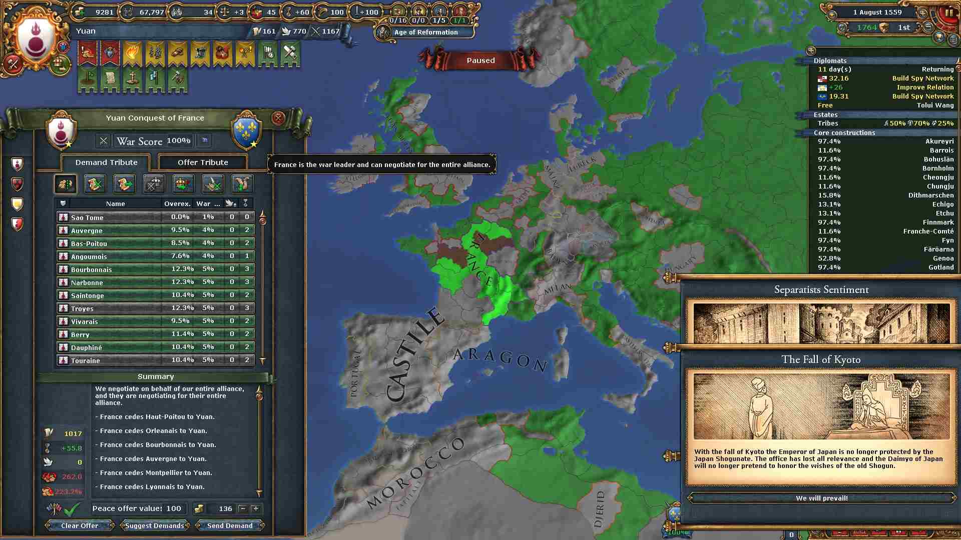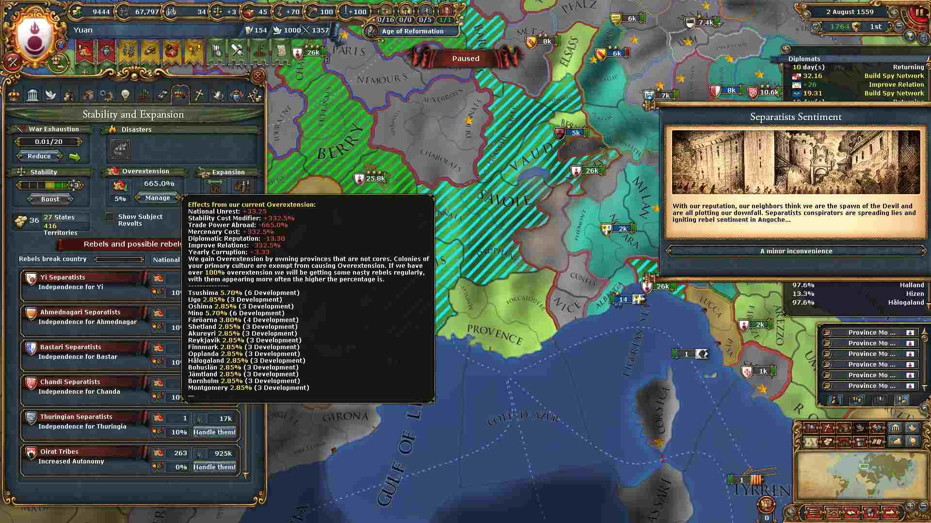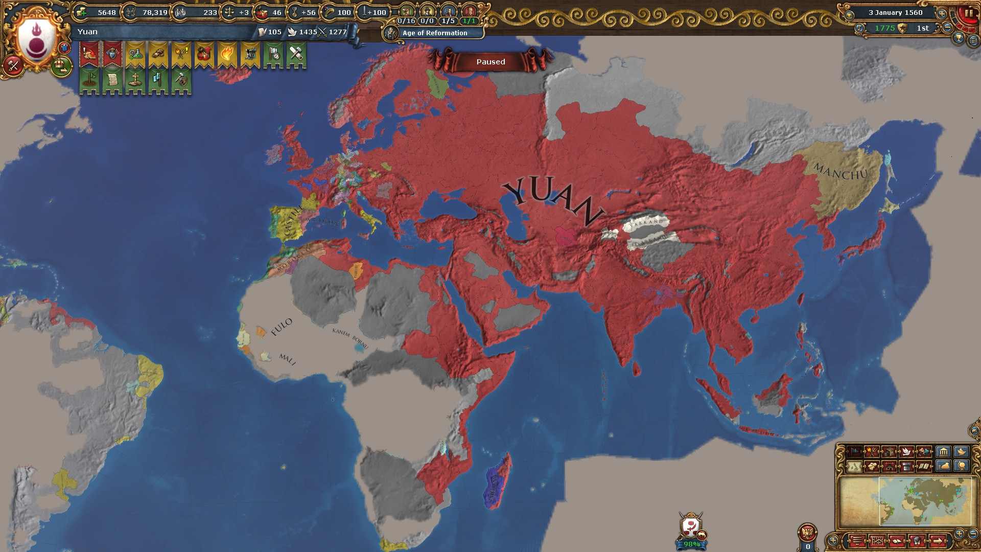 先のグレートブリテン戦で奪った領土のコア化が終わり、大元初の植民地国家が誕生しました。