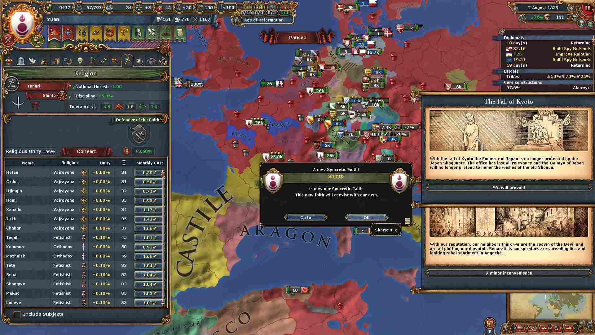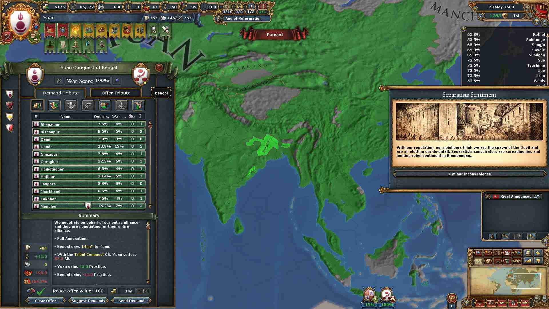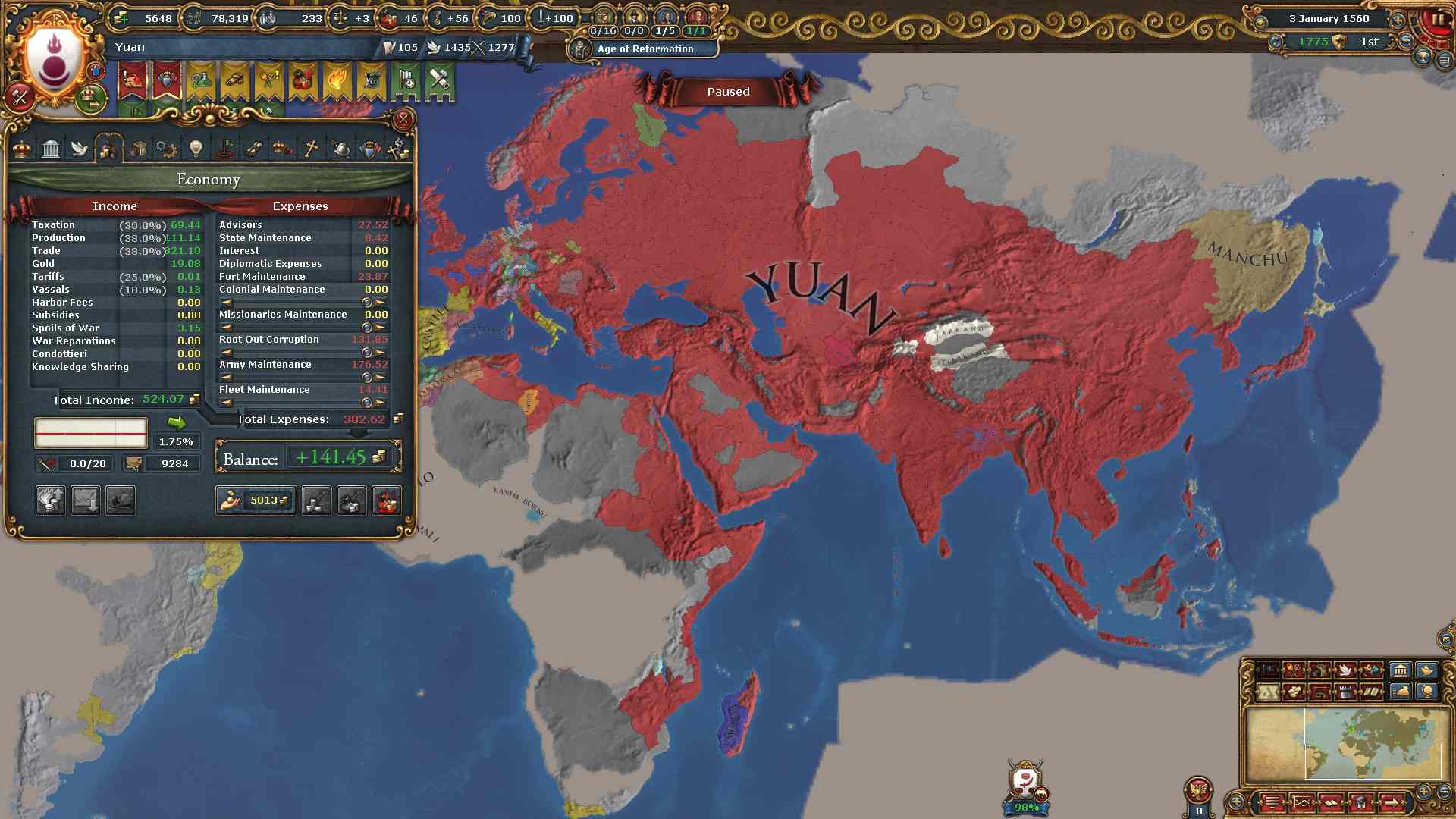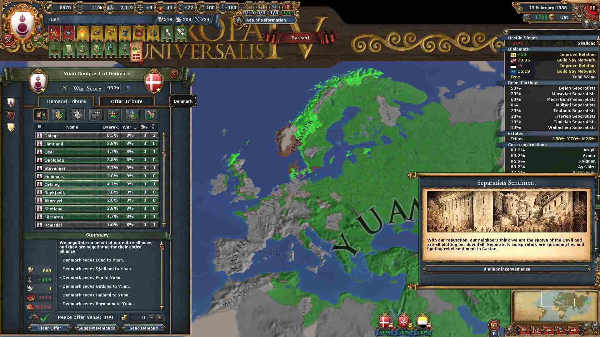 先のグレートブリテン戦で奪った領土のコア化が終わり、大元初の植民地国家が誕生しました。