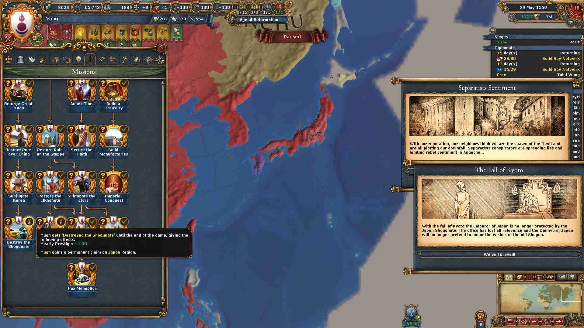 日本戦の結果、ミッション「朝鮮の平定」及び「幕府の討伐」を続けて達成出来ました。