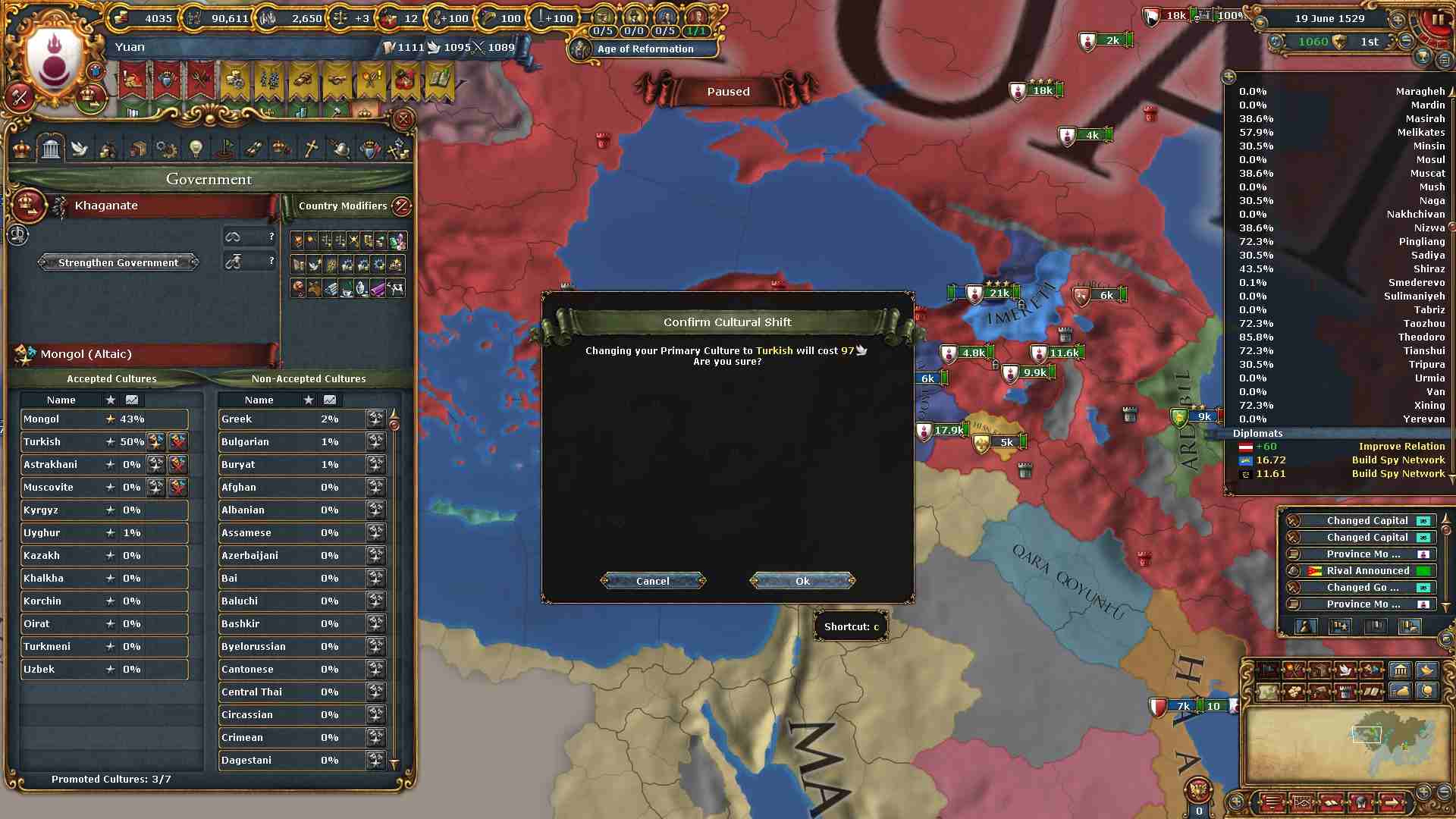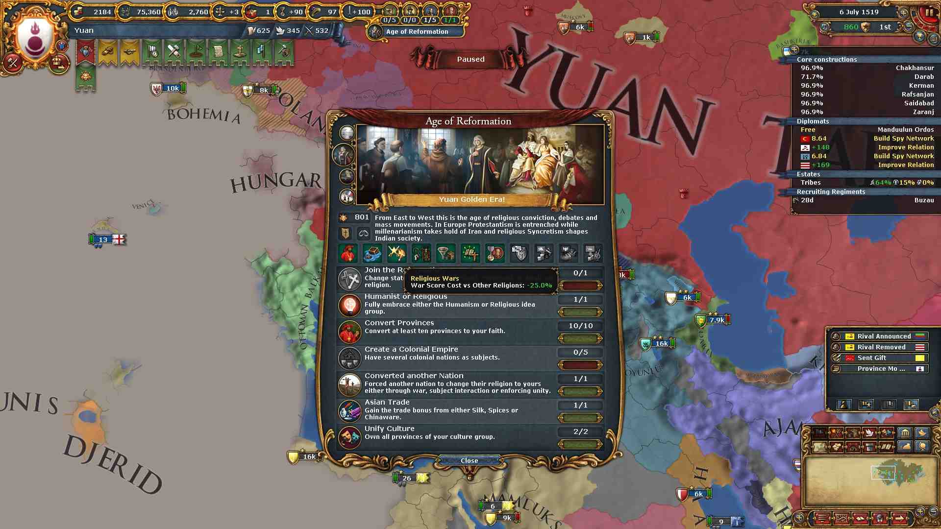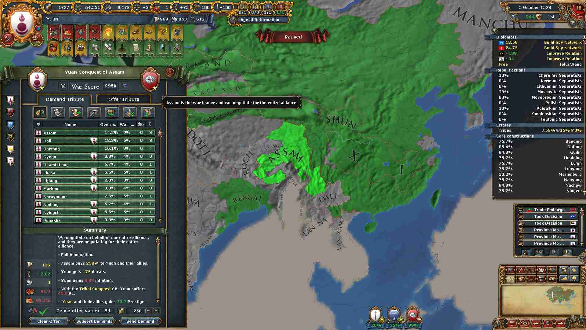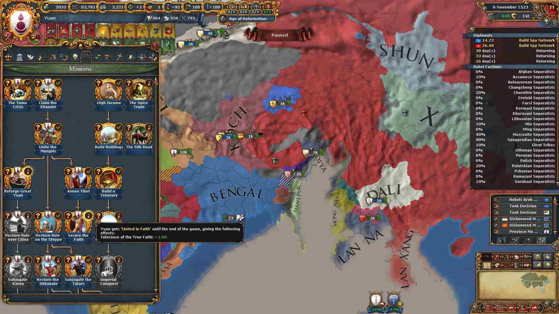 チベット地域に侵攻した結果ミッション「チベットの併合」及び「信仰の保護」を一気に達成出来ました。