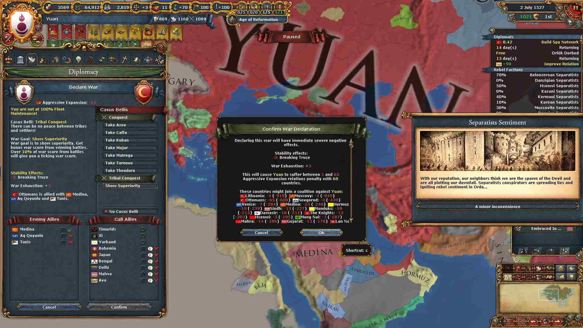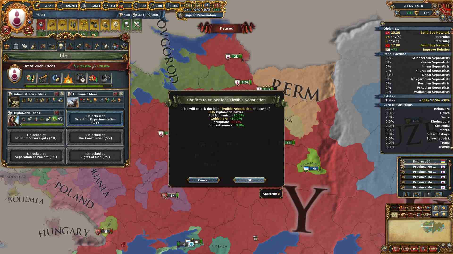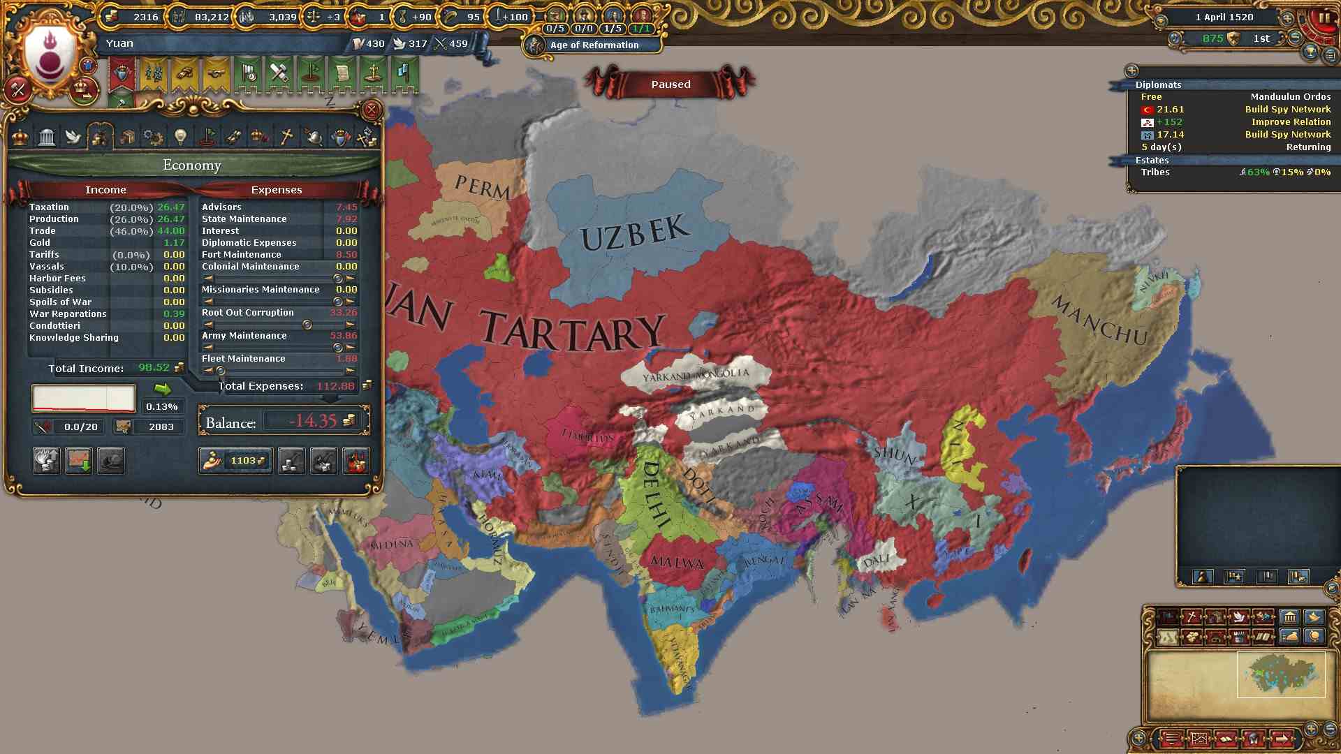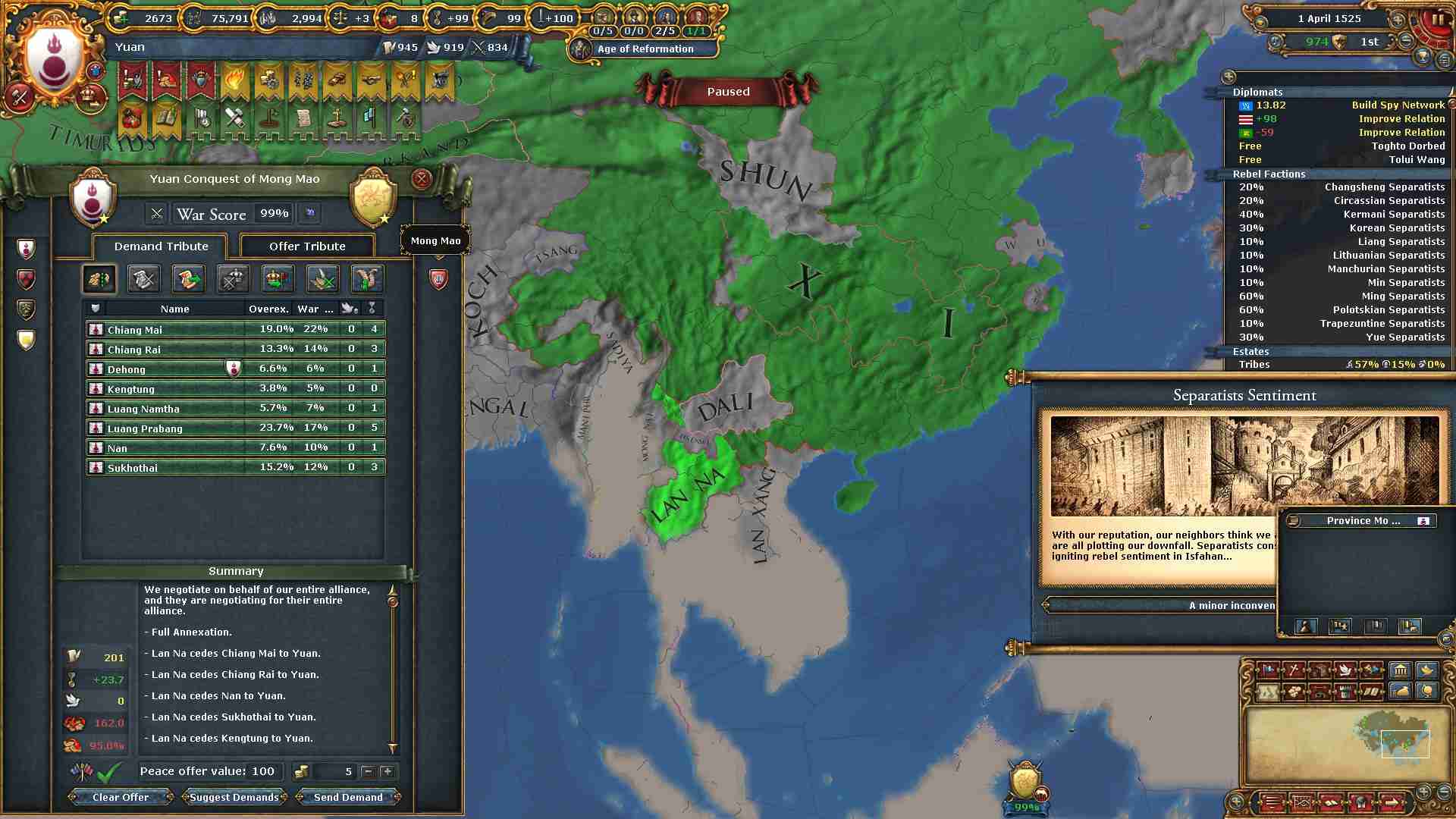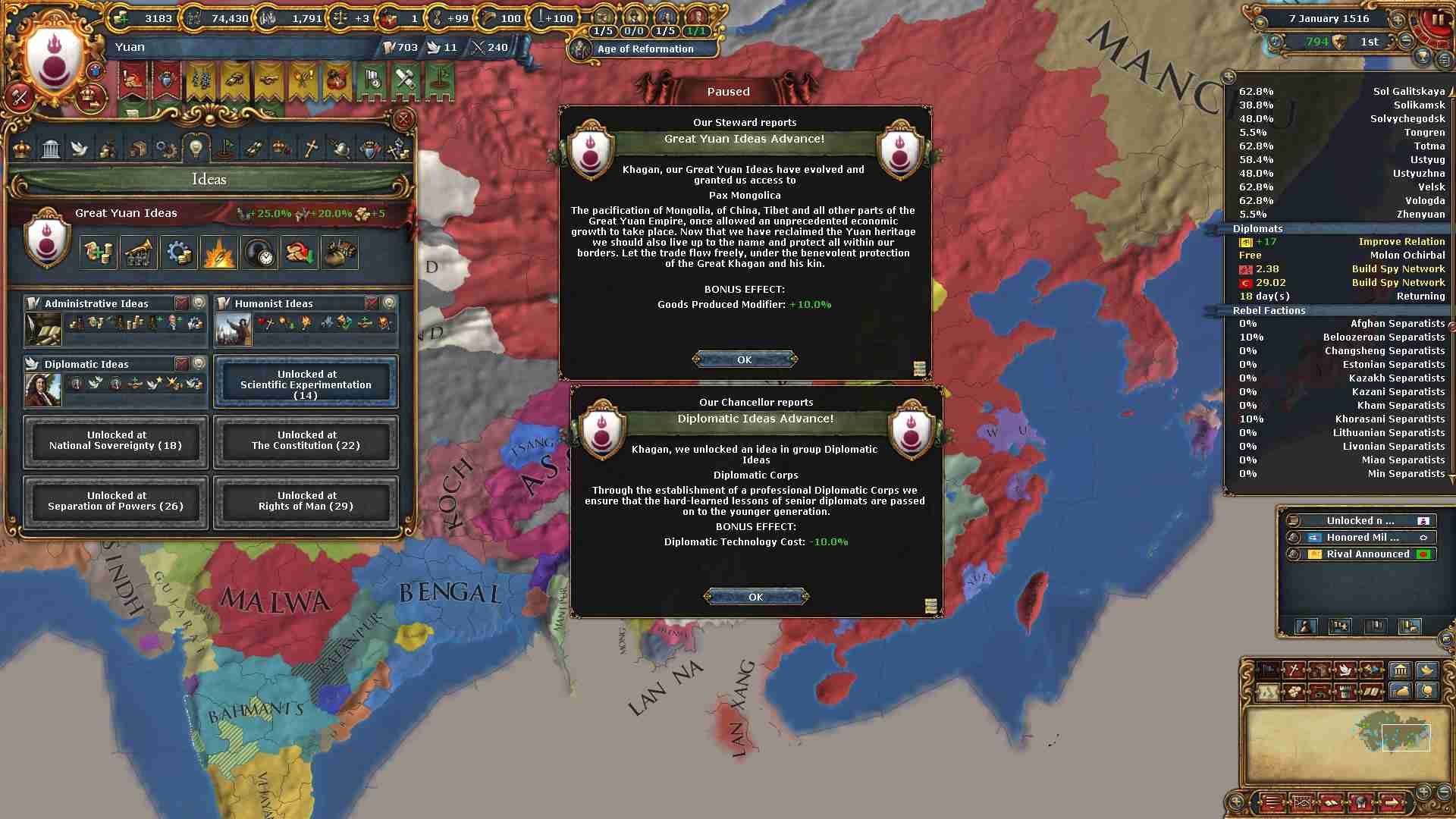 チベット地域に侵攻した結果ミッション「チベットの併合」及び「信仰の保護」を一気に達成出来ました。