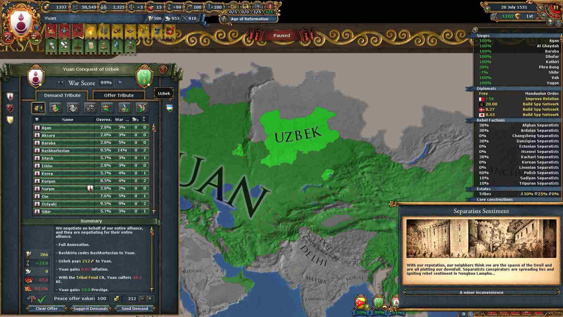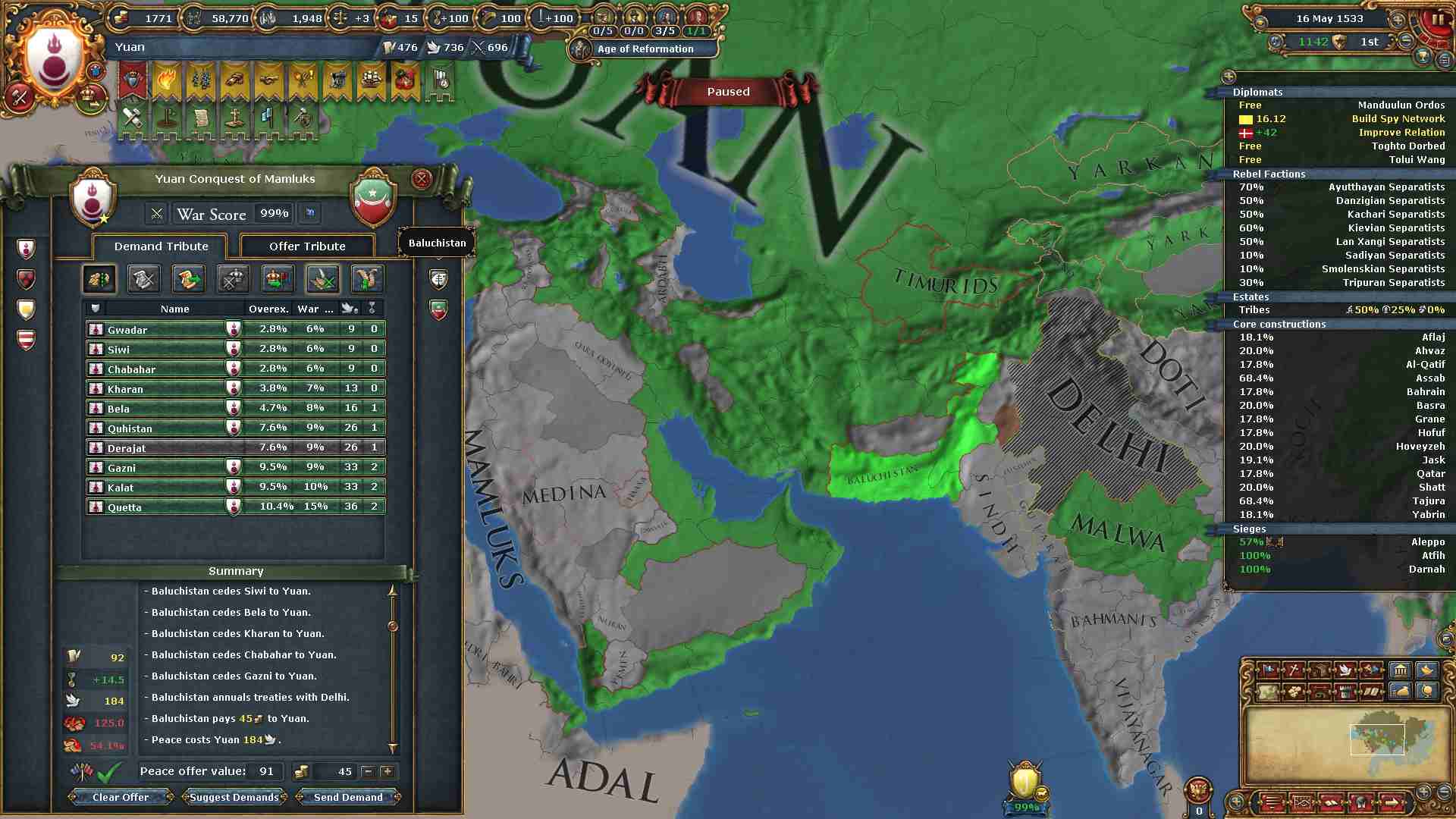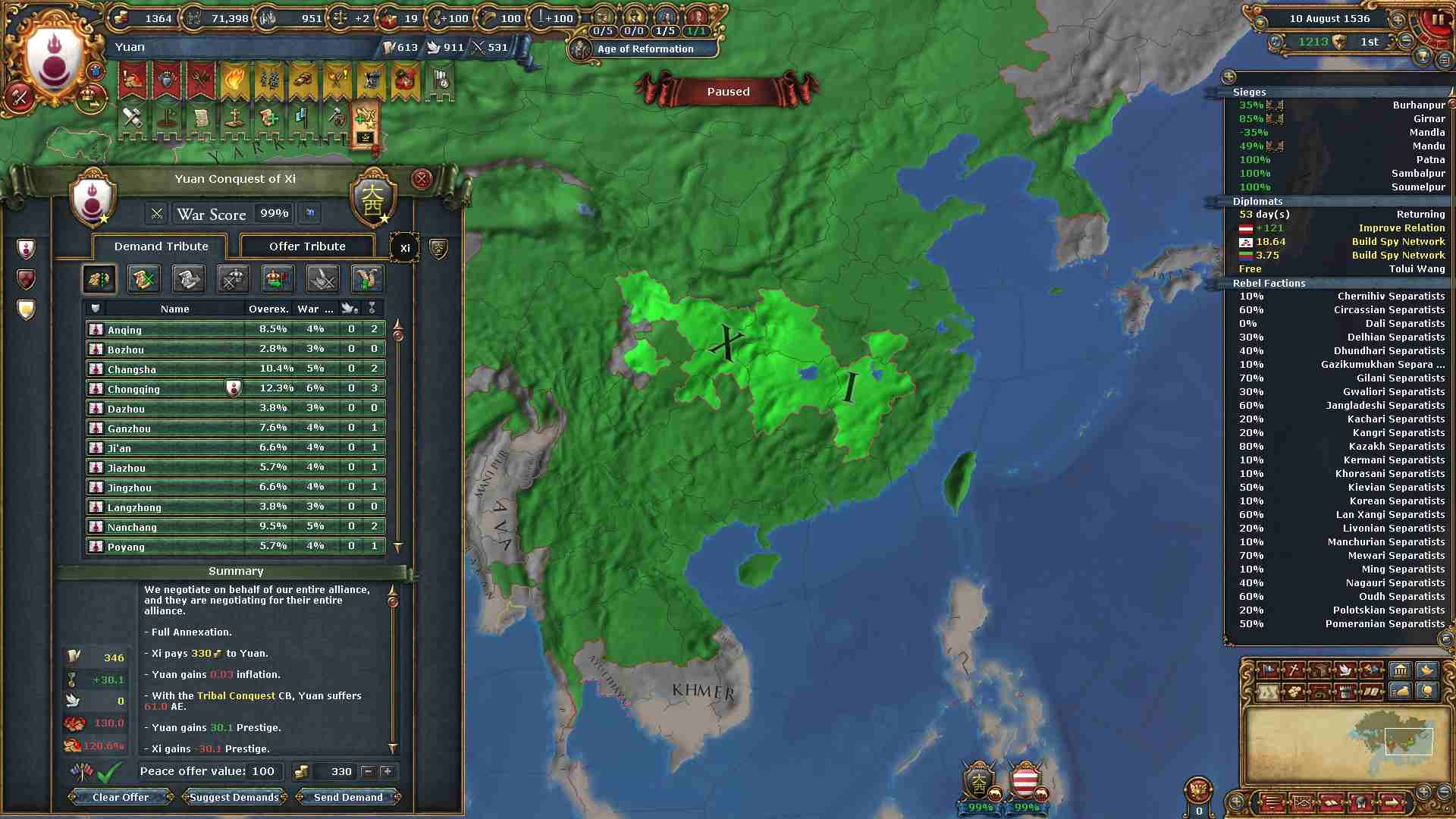 モンゴル、華北、中央アジア、ポントスステップ、ペルシア、ホラーサーンの各地方を制覇したのでパクス・モンゴリカのミッションを達成出来ました。