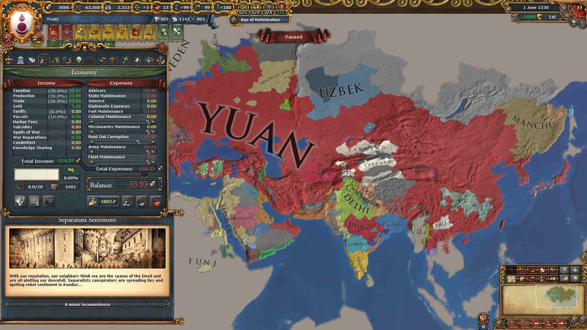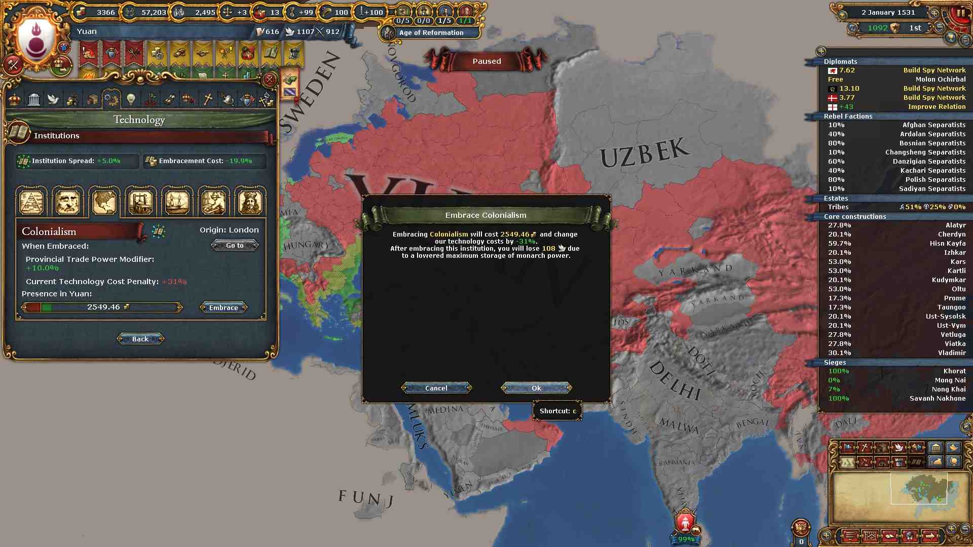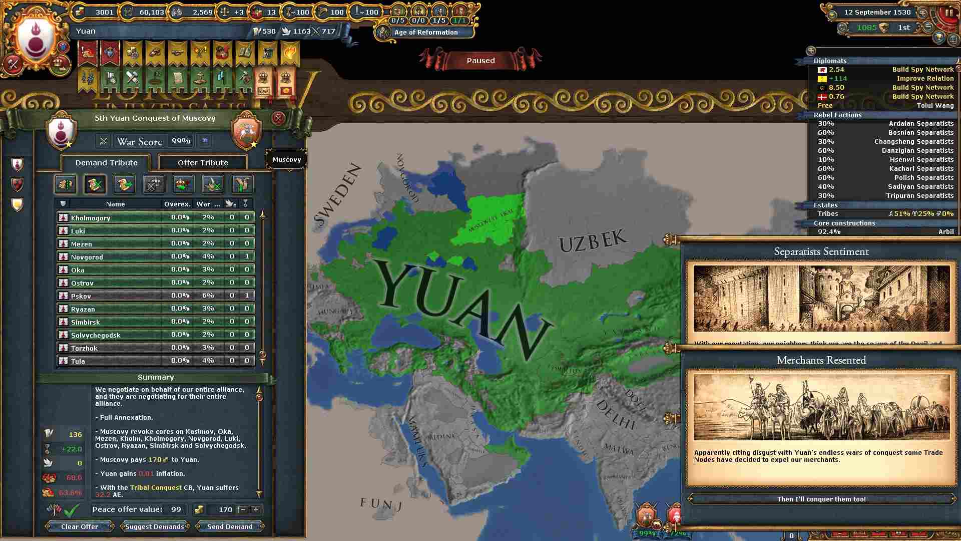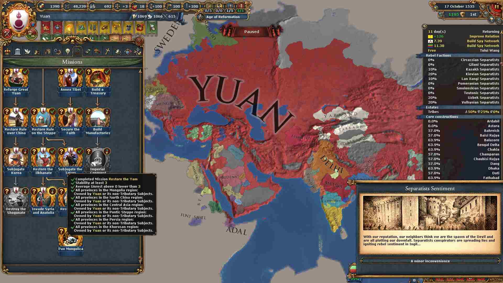 モンゴル、華北、中央アジア、ポントスステップ、ペルシア、ホラーサーンの各地方を制覇したのでパクス・モンゴリカのミッションを達成出来ました。