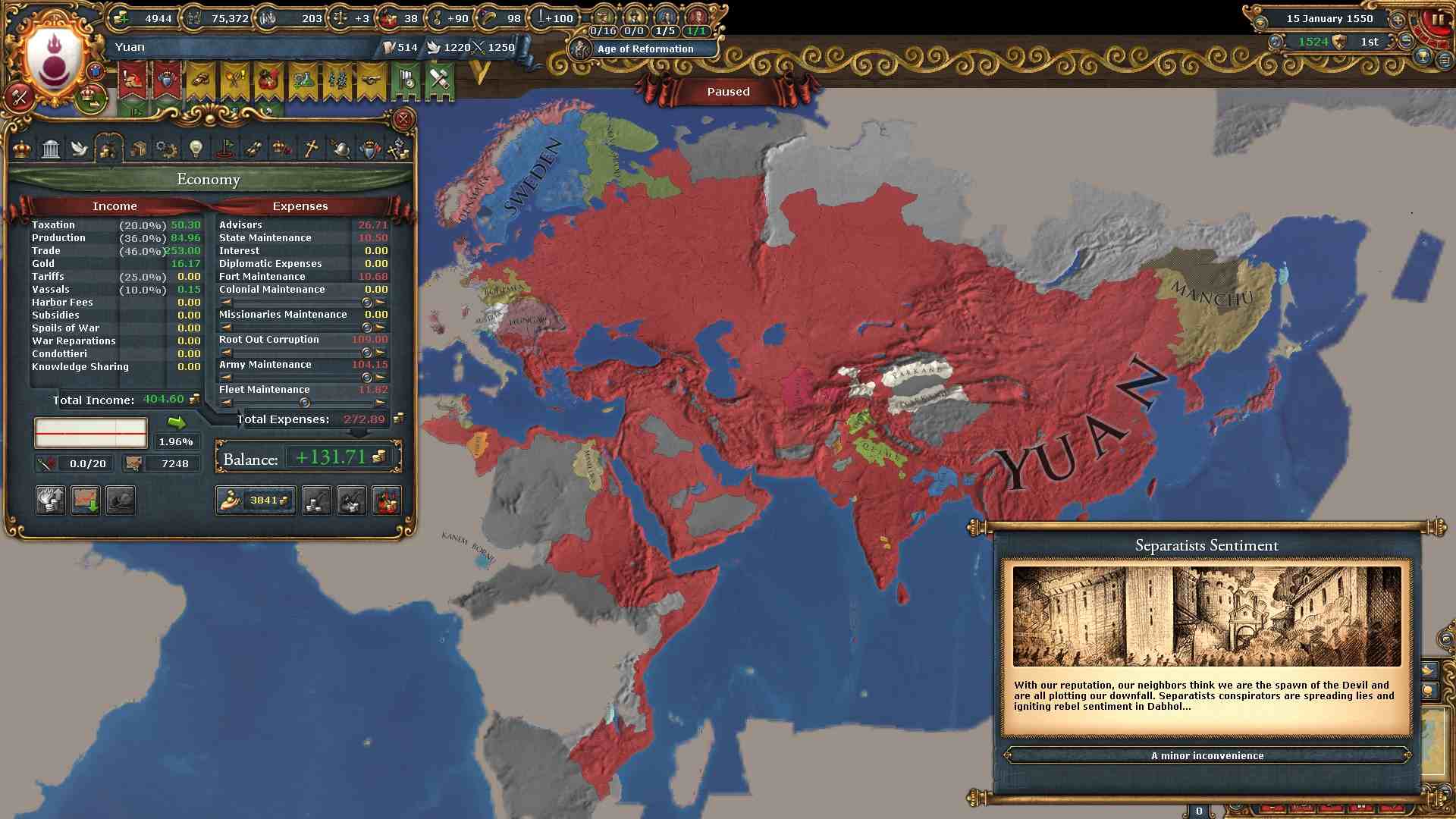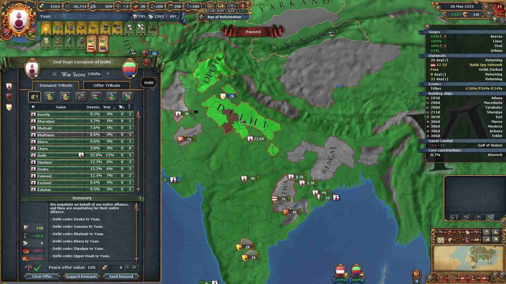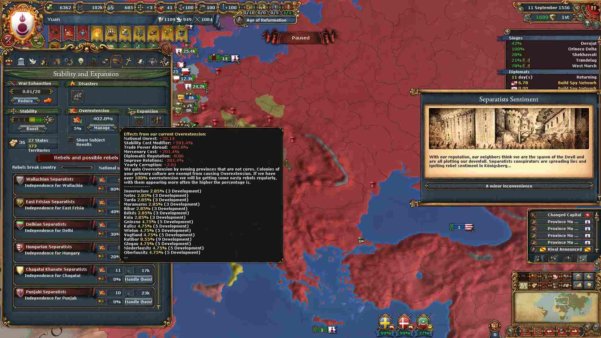 容赦なく欧州勢から領土を奪っているので過剰拡大が400%を超えています。