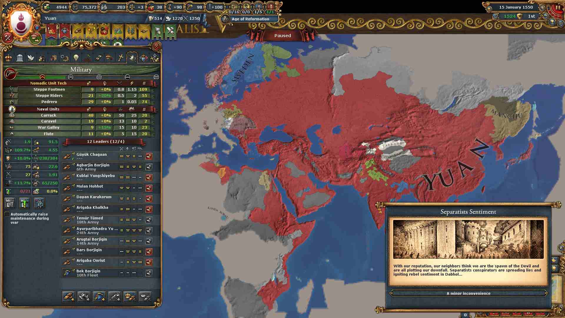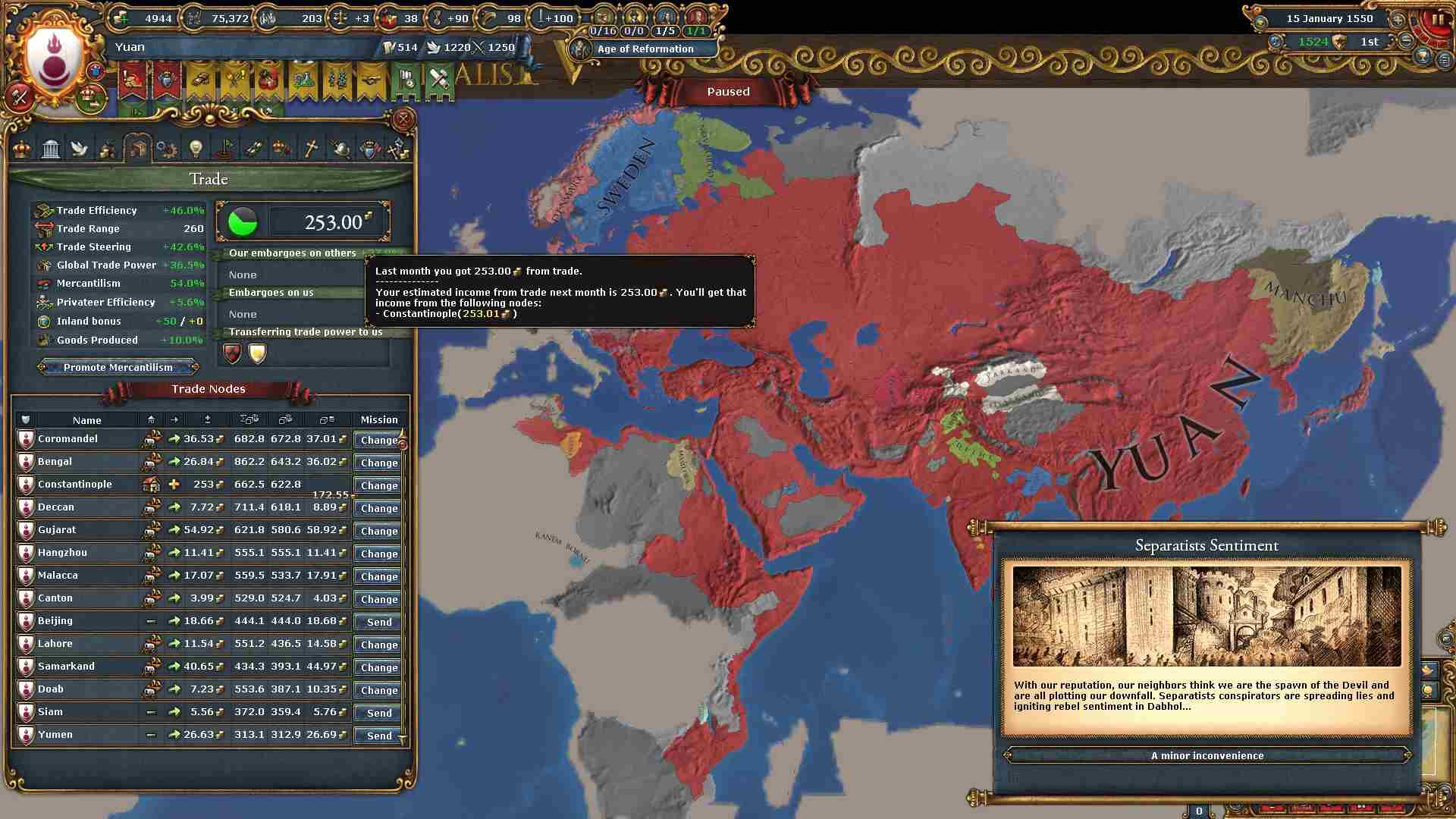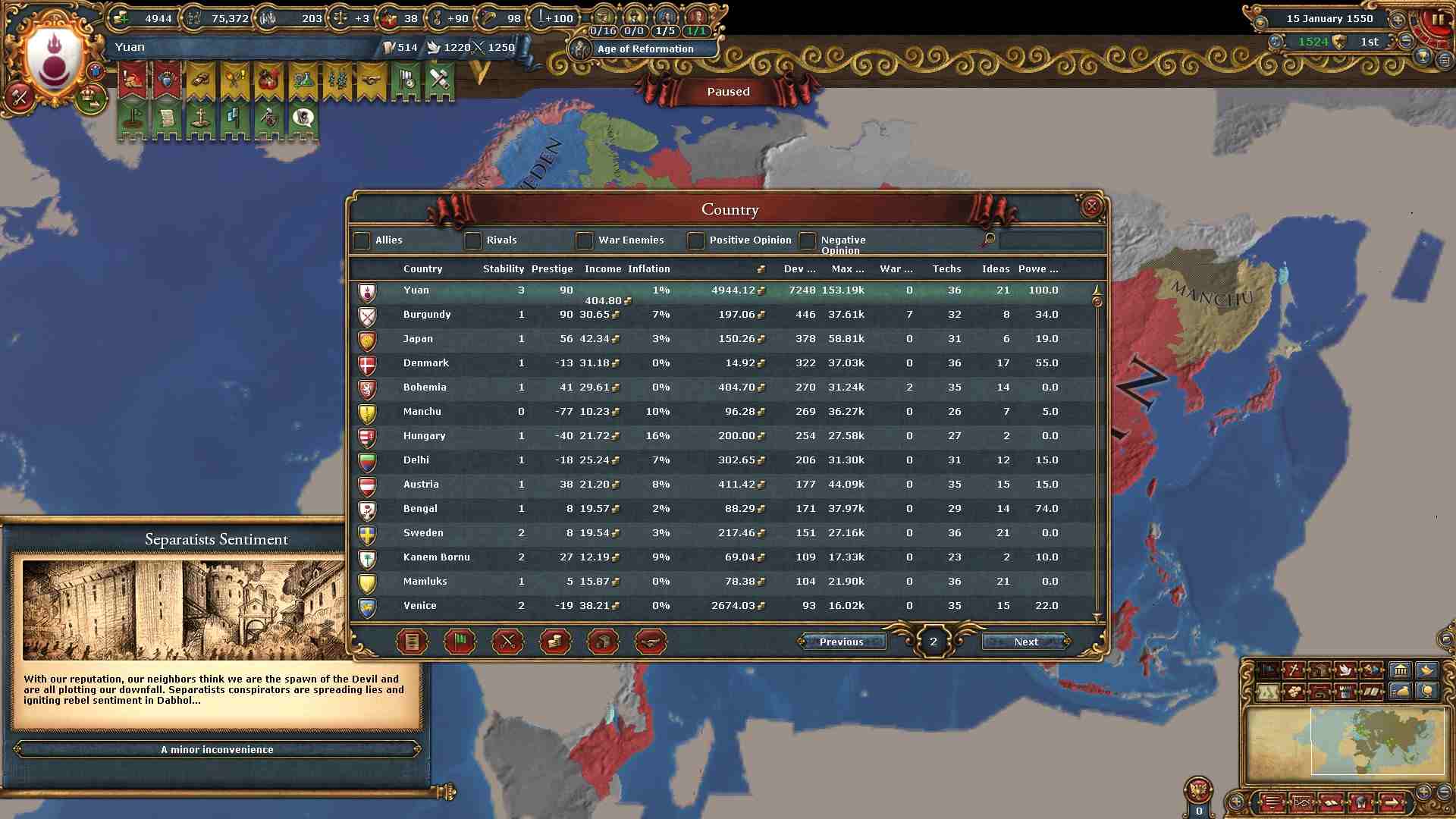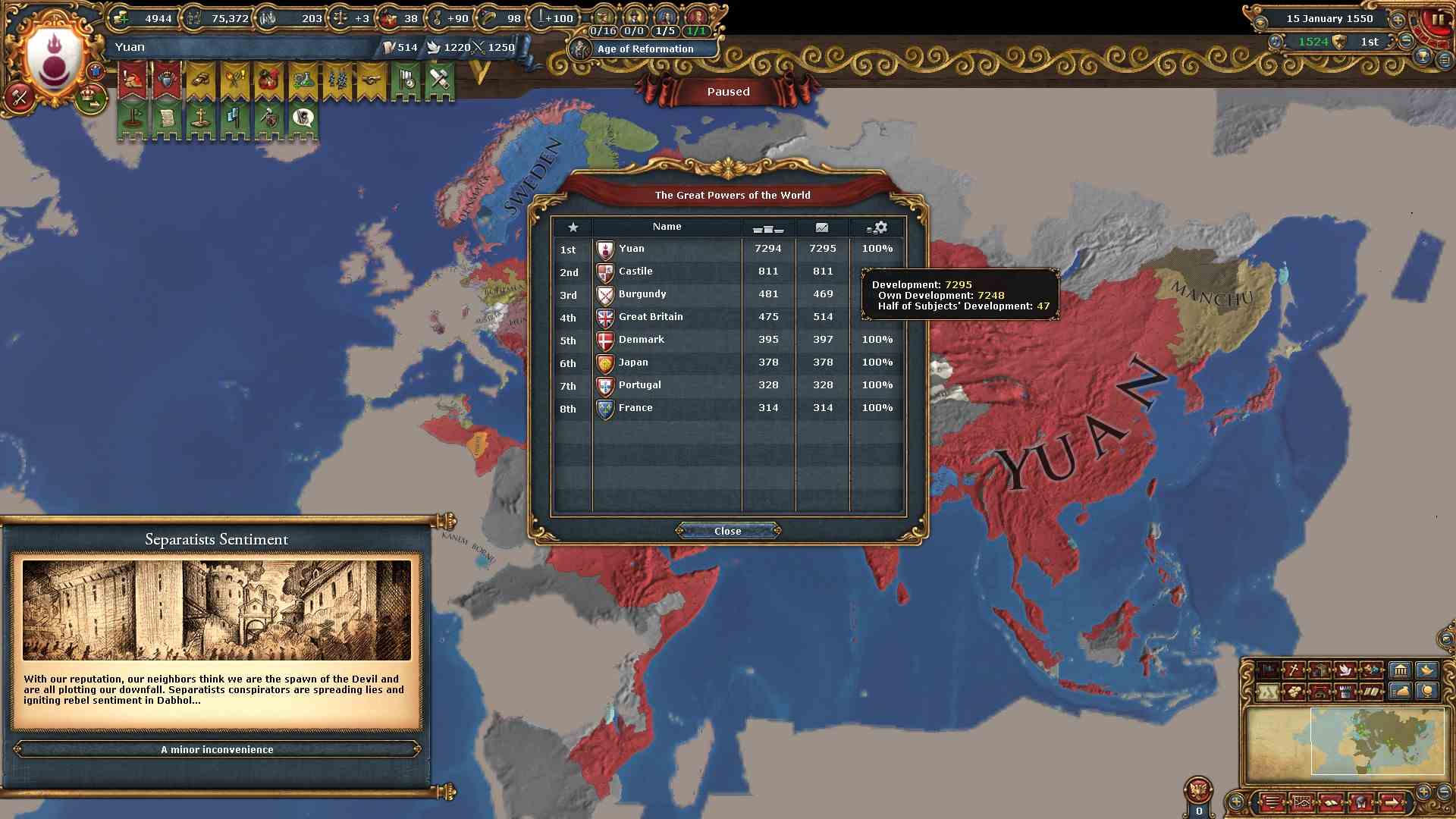 容赦なく欧州勢から領土を奪っているので過剰拡大が400%を超えています。