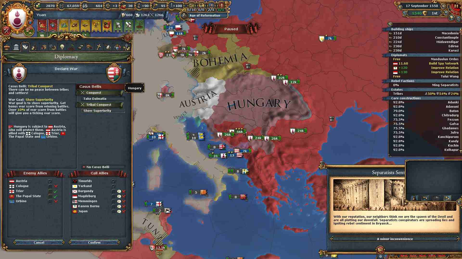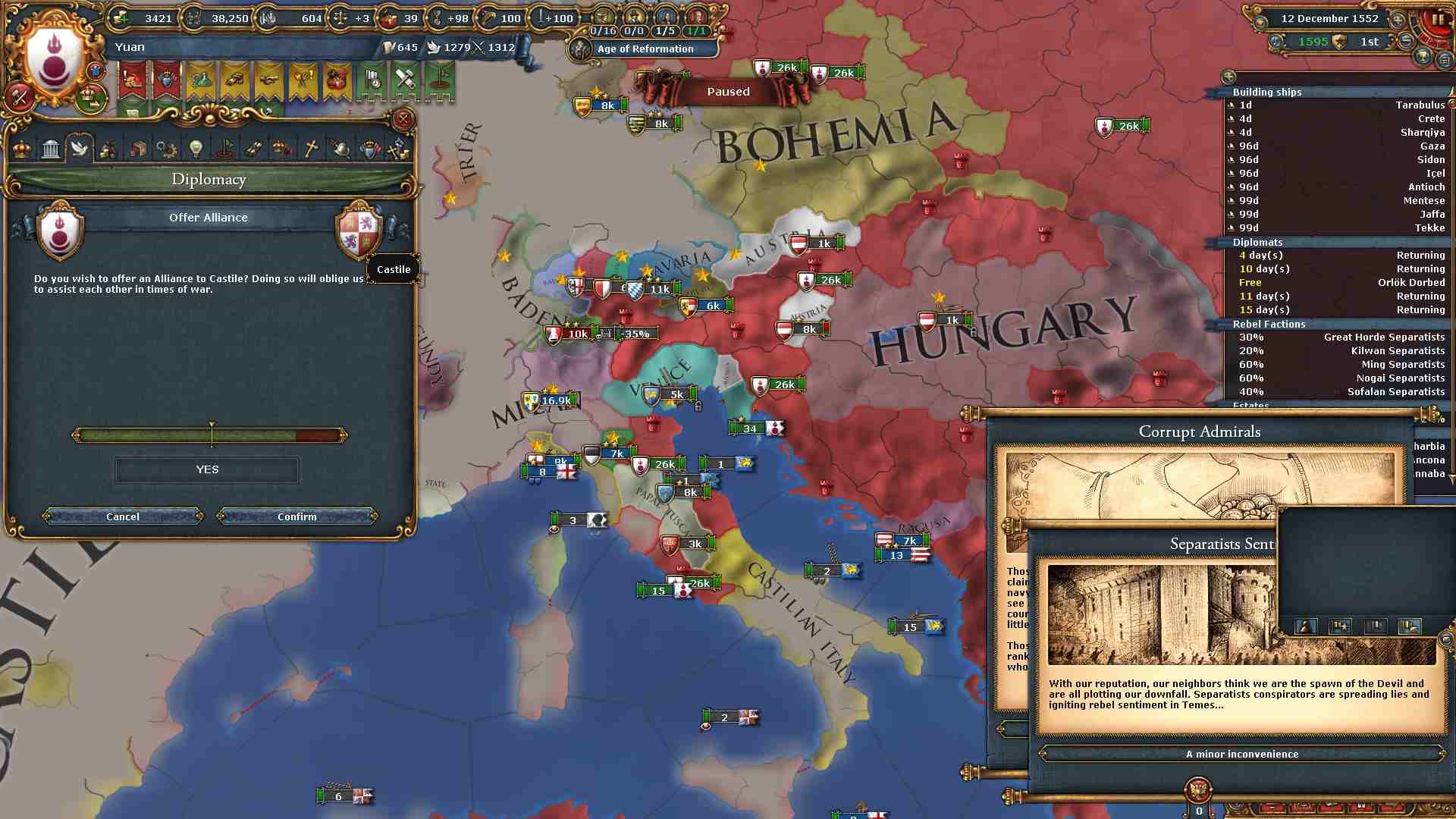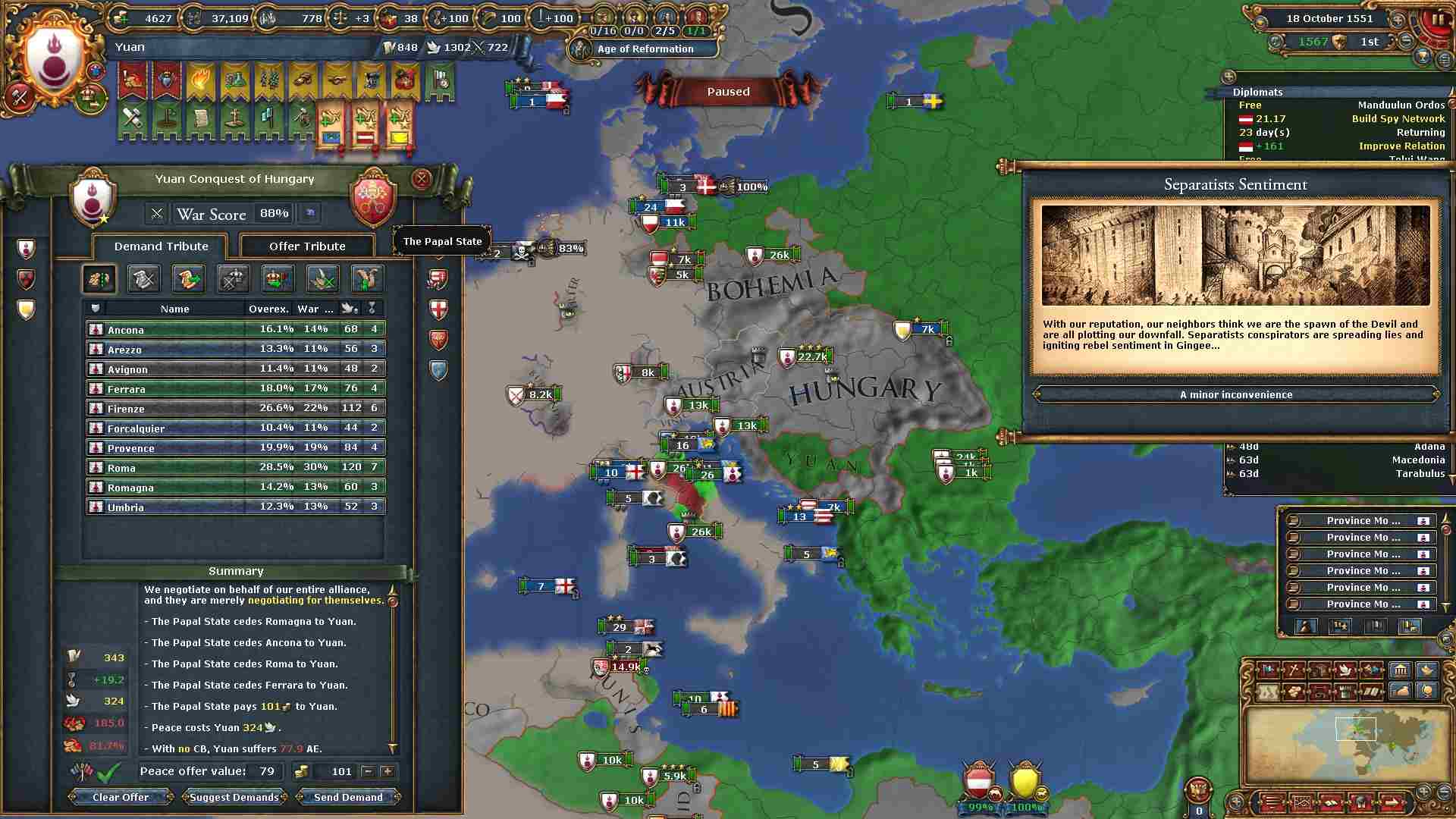 教皇領から奪った領土がカステラと隣接したので、カステラに大元が見つかってしまいました。