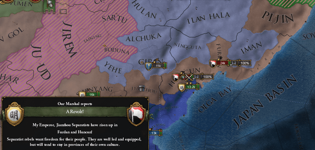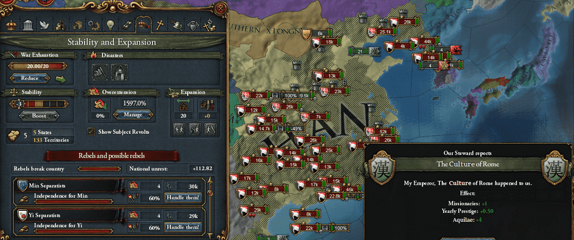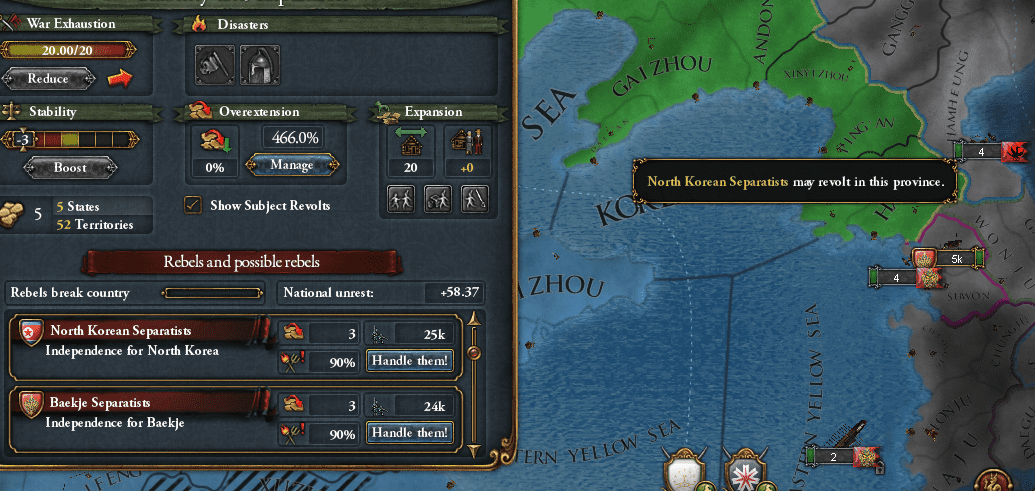 満洲は征服すると反乱軍の巣窟になるな。以前のプレイでは下手に拡張した朝鮮や