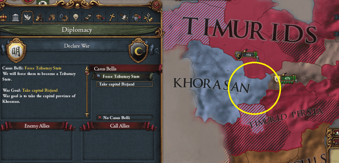 その間、王振が遺した優秀な軍事部門により、対外拡張だけが活発にすすめられた。明軍の中には、かつて土木堡の戦いで捕らえられたエセンの姿もあった。敗北の後オイラトがすぐに後継を立てたため帰る場所を失ったエセンは、対モンゴル・オイラト遠征に投入されないこと、将来的に征服地を自らの領国とすることを条件に王振に取り込まれたのである。西方の司令官となったエセンは西班牙大方陣と蒙古騎兵を組み合わせて才覚を開花させ、王振をして「土木堡の戦いが5年遅ければ、我々が全滅させられていただろう」と言わしめた。モグーリスタン*15を破ったエセンはさらに西進し、自らと同じキュレゲン(婿)の家系であるティムール朝の内乱に乗じ、景泰14年(1474年)にヘラートを征服した。老いて思慮深くなり、視野も広がったエセンは、かつてオイラト時代に熱烈に欲していた「ハーン」の位に執着しなくなっていた。その代わりとして、エセンは新天地にかつて存在していた国の名を取り、その国の「ハーン」に相当する名を名乗った。エセン・シャーの誕生である*16。