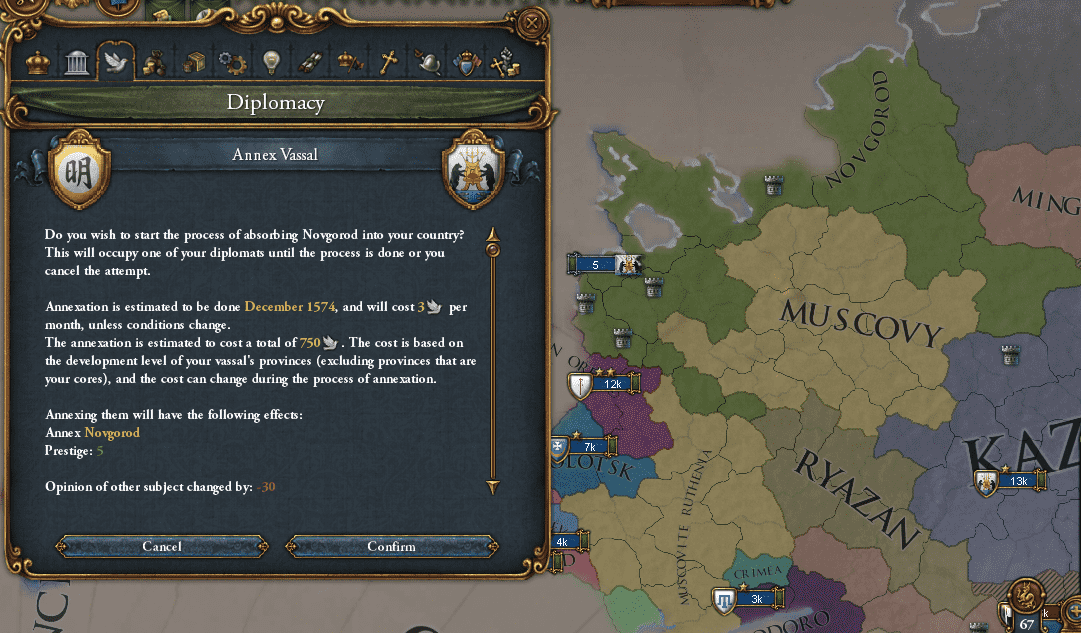 そうじゃ、一つテクニック面で付け加えておくと、植民地国家は収支が+2.00(乳直地1つ分の維持費)以上でないと自分で植民してくれないのじゃ。