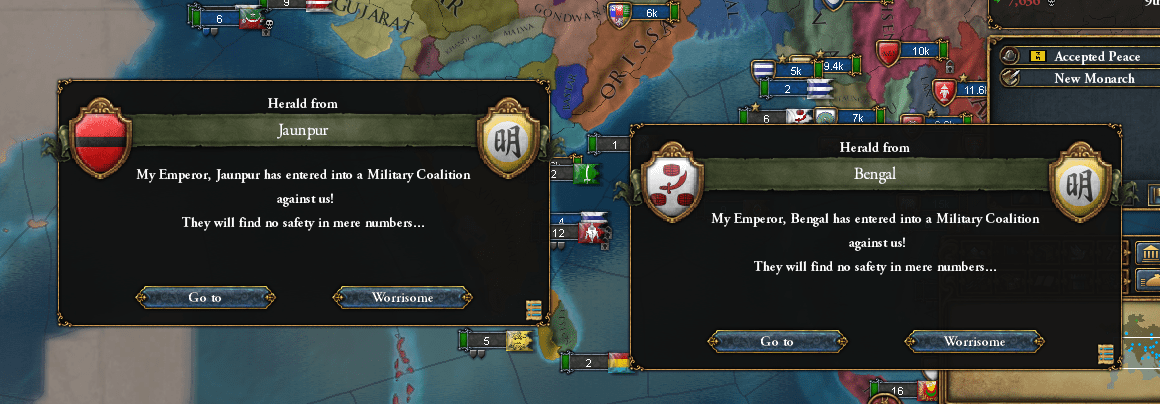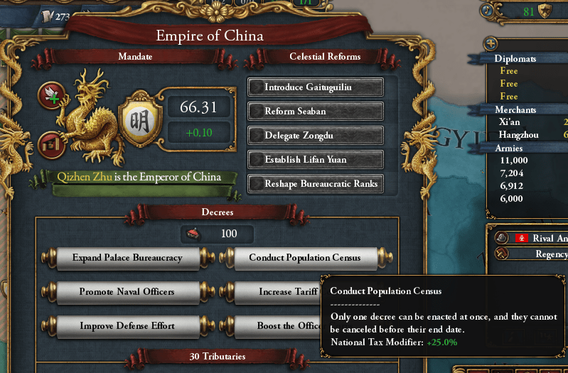勅令も人口調査(Conduct Population Census)に切り替えました。明の全収入からすれば+4ダカットの収入増は小さなものですけど、お金は無いに越したことはありませんからね。