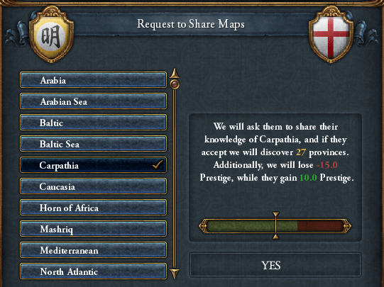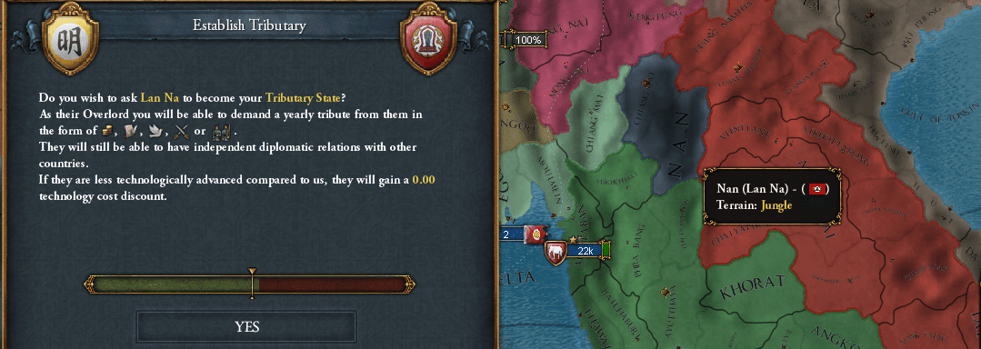 同じ朝貢国でも、同盟を結び関係を確定させてから朝貢した国からは貸してくれるが、直接朝貢したことで態度がUnknownのままになっている国からは貸してくれぬ。面倒くさいのう。