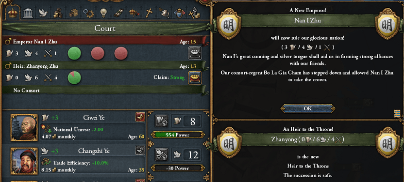 北京ノードは現状数少ない明の貿易収入の生命線じゃからの。終戦と同時に内政も動いたぞい。即位20年をもって景泰帝(3, 4, 1)が退位、成化帝(4, 5, 6)が即位された。皇太子朱