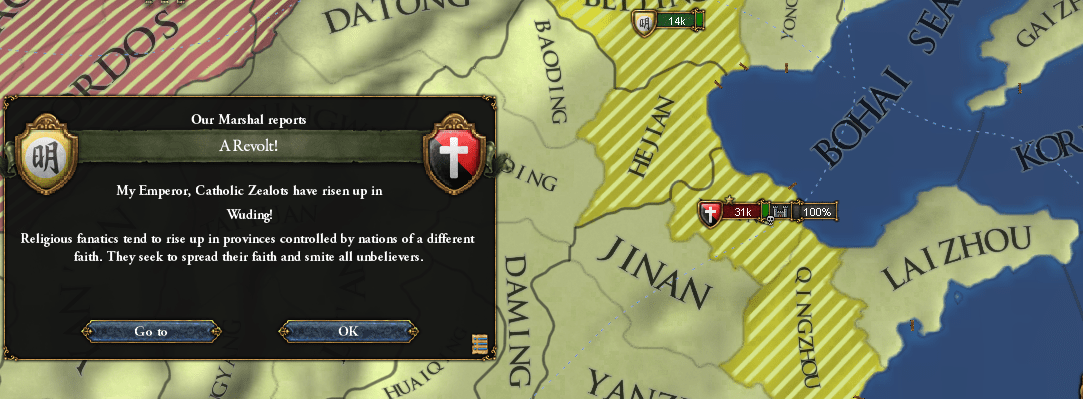 反乱進行度が40%以上になると、そのRebel Factionが活動しているプロビの反乱タイプは固定される。高Unrestの異教プロビに次々に宣教師を送り、反乱タイプをZealotに塗り替えることもできるんじゃ。