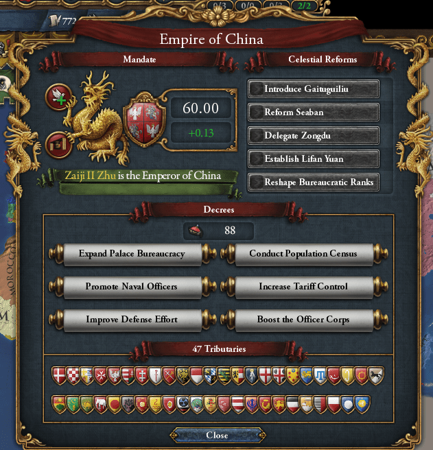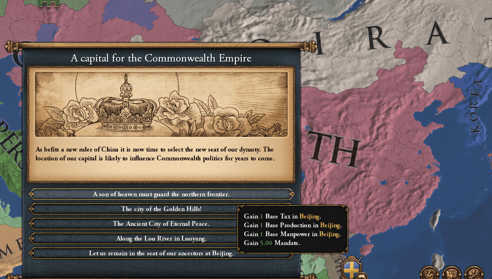 1684年4月、遷都イベントが発生した。明以外の国が中華皇帝になると発生するらしく、首都を北京、南京、西安(選択すると長安に改名)、洛陽に移すか、元の首都を維持するかという5択が提示されるのである。