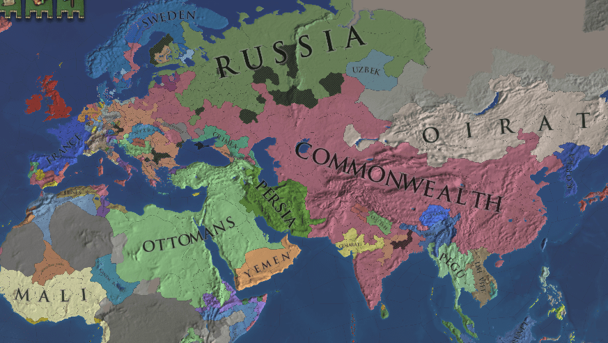 勝手に終わらすな!ヨーロッパ領を占領されるのもインドが真っ黒になるのも最初から想定済みだ。オスマンは既にコンスタンティノープルを落とし、スカンディナヴィアではスウェーデン軍が出払っているうちに要塞群をすべて抑える。ここからゆっくりとロシアへ軍を戻し、モスクワを落とせば勝ちが見えてくるはずだ!インドは全部終わってから掃除に向かってもまだ間に合う。