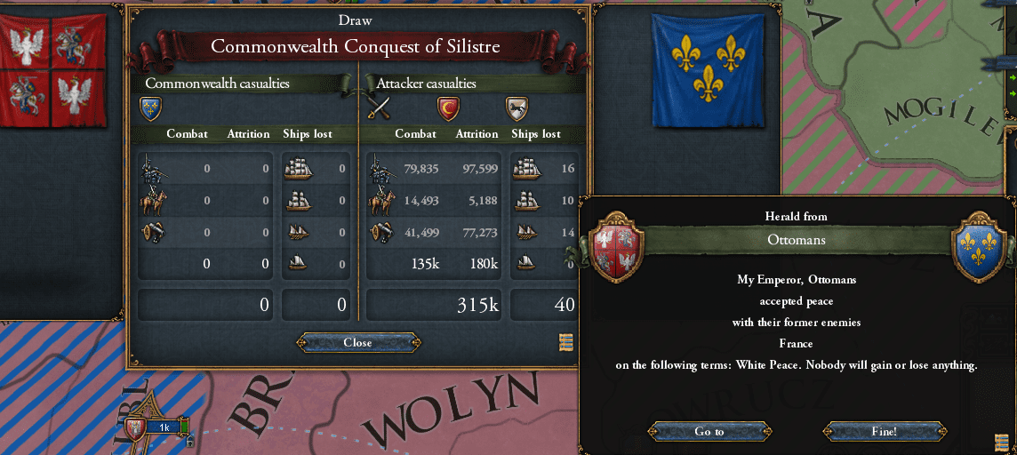 釈然としませんねぇ。まあ、我々も目標を見失ってしまったのは確かです。一応1714年までは時間を進めたのですが、オスマンとの終わりが見えない戦争。未だに同盟を切れないフランス、朝貢下でうごめくオイラート、ペグー、ペルシア。大内乱とLD50%越えを繰り返して使い物にならないロシア・・・こうした状況で、ついに正統帝の厭戦がオーバーフローしました。