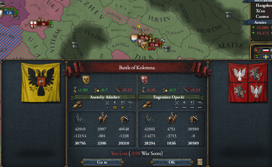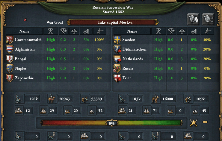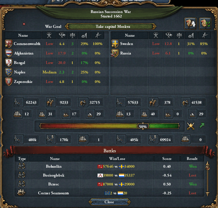 というわけで3年後の1662年、アンア女帝が死去してスウェーデンがロシアを継承。コモンウェルスも以前からロシアをライバル視していたことからこの連合成立に異議を唱えて同盟を破棄、スウェーデンvsコモンウェルスのロシア継承戦争が圧倒的スケールで勃発したのだ。