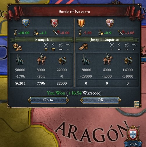 アラゴンが負けすぎないよう支援していたこともあり、一戦でマドリードを割譲させることができた。