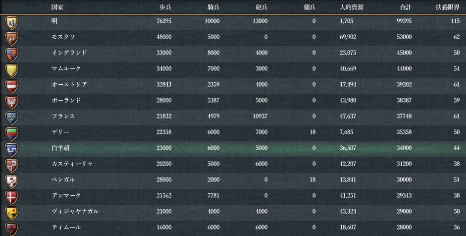 陸軍は扶養限界44Kに対して34Kを雇用。9番手に付けておりますが上位にはマムルークやモスクワ、オーストリア、ポーランドなど周辺国が顔をそろえております。