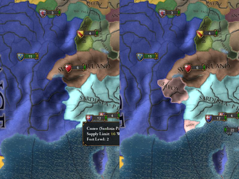 左がヴァニラ状態のフランス国内、右が本MODのフランス国内。