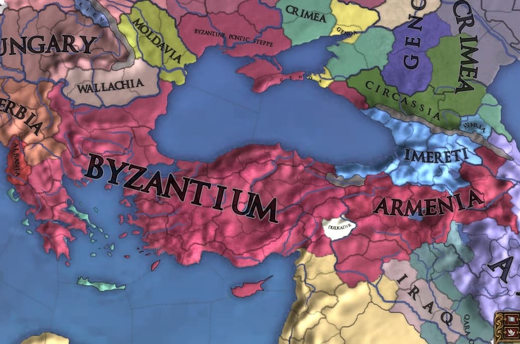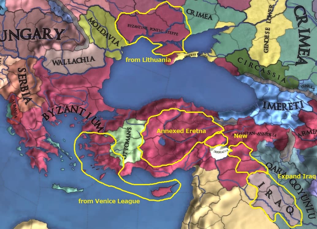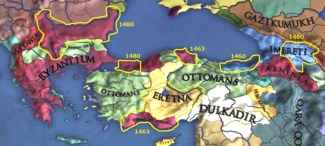 また早期に大国を失った各地方にレアな各国が拡張する余地を生み出すことになりました。上の画像のArmeniaやHisyn KayfaはByzantiumさえいなければ大いに繁栄するはずだったのでしょう。ただ、こうした国家は栄枯盛衰の末に一か国を残して結局は地上から姿を消していくことになるのです。