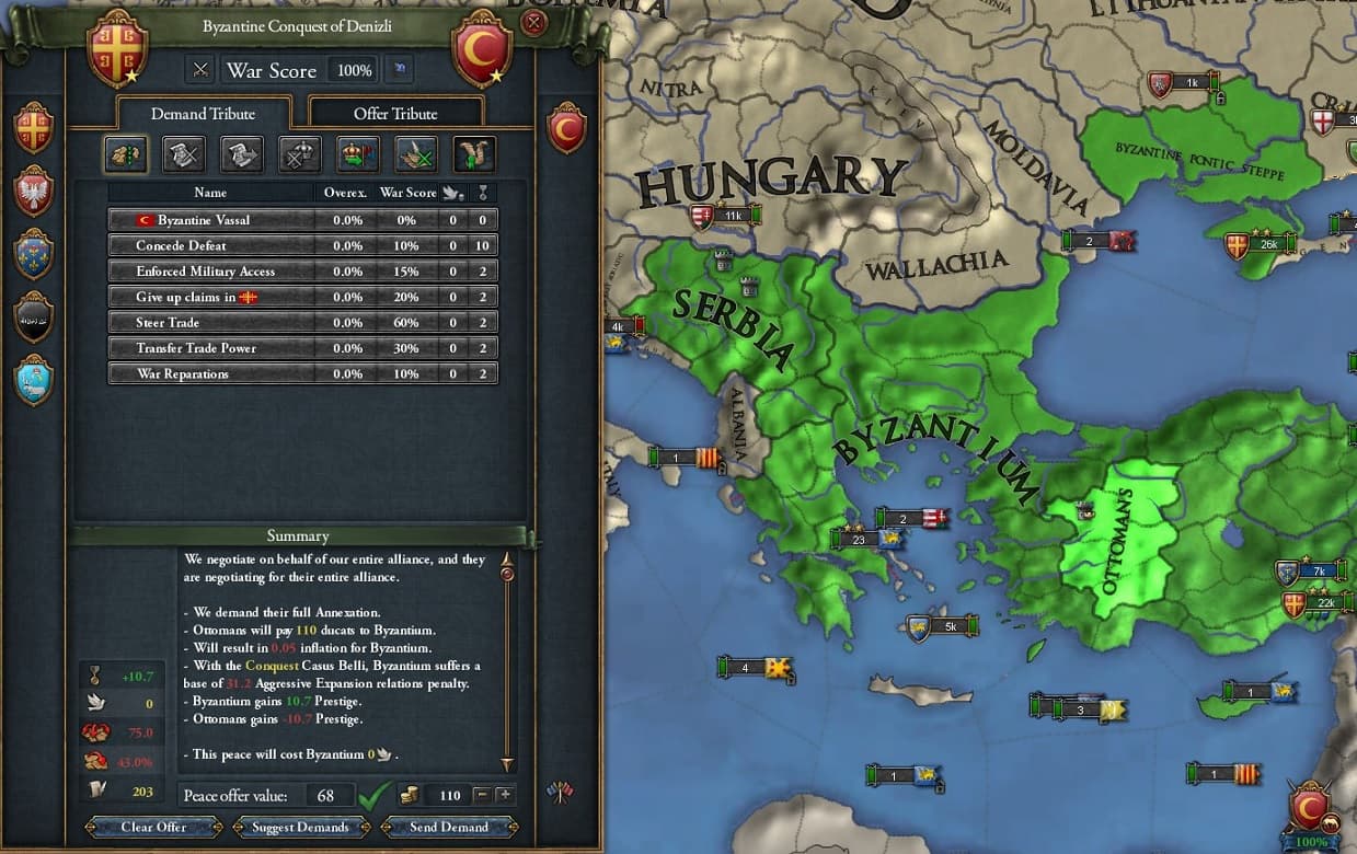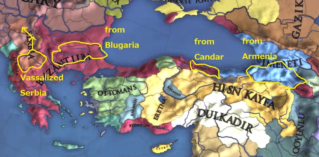 2度の敗北で疲弊し分断されたOttomansからはSerbia、Bulgaria、Candar(一度は征服されていた)、Karamanが次々と離脱し、その都度Byzantiumのエサとなっていくのでした。