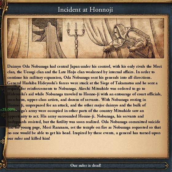 本能寺の変は割合発生確率が高い気がします。1回目は仕方ないのにしても、2回目以降はもうちょっと身辺警護に気を付けて欲しいところ・・・。