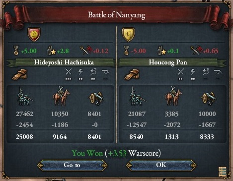 南陽会戦で中国軍を撃破する蜂須賀秀吉将軍。偶然だが「秀吉」の名前を持つ将軍に撃破される明軍。
