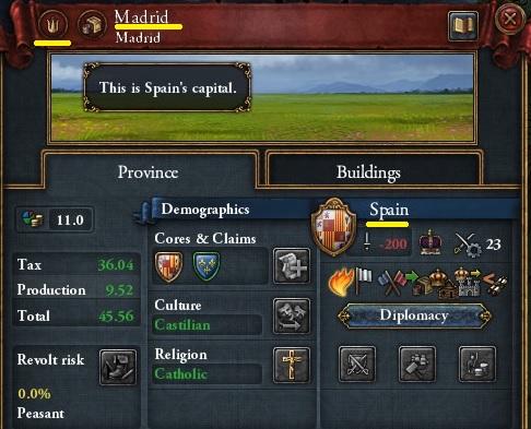 最終的な攻略目標の一つである、マドリード。スペイン成立がなければ一般州のままだが、成立すると首都になる。