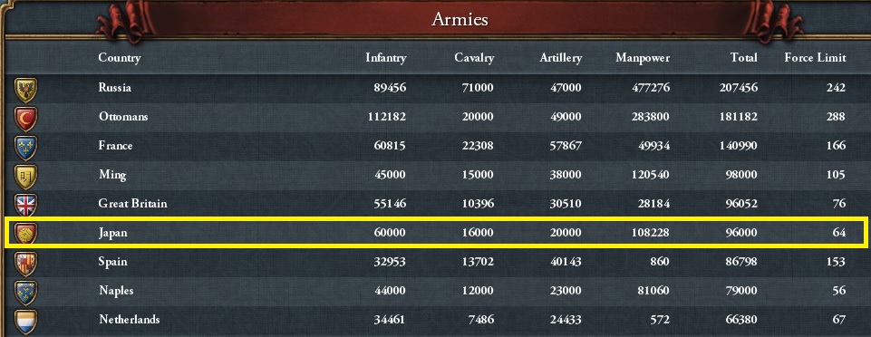 ただし、扶養限界は64と列強最下位であり、32個連隊を超過扶養していることになる。