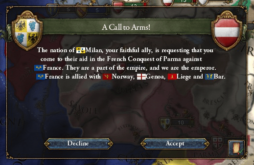 ミラノはかつてオーストリアがブルゴーニュと対立した時にはブルゴーニュ側に立ってオーストリアとは敵対した過去がありましたが、フランスの侵攻に対してはオーストリアに助力を嘆願しました。