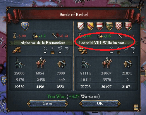 かつてフィリップ突進公と刃を交えたときに彼を惚れ込ませたように、優美な容姿と騎士としての高潔な人柄、そして将軍としての類まれなる資質を備えていたのです。