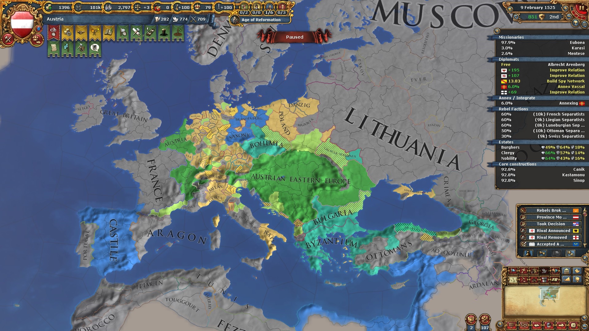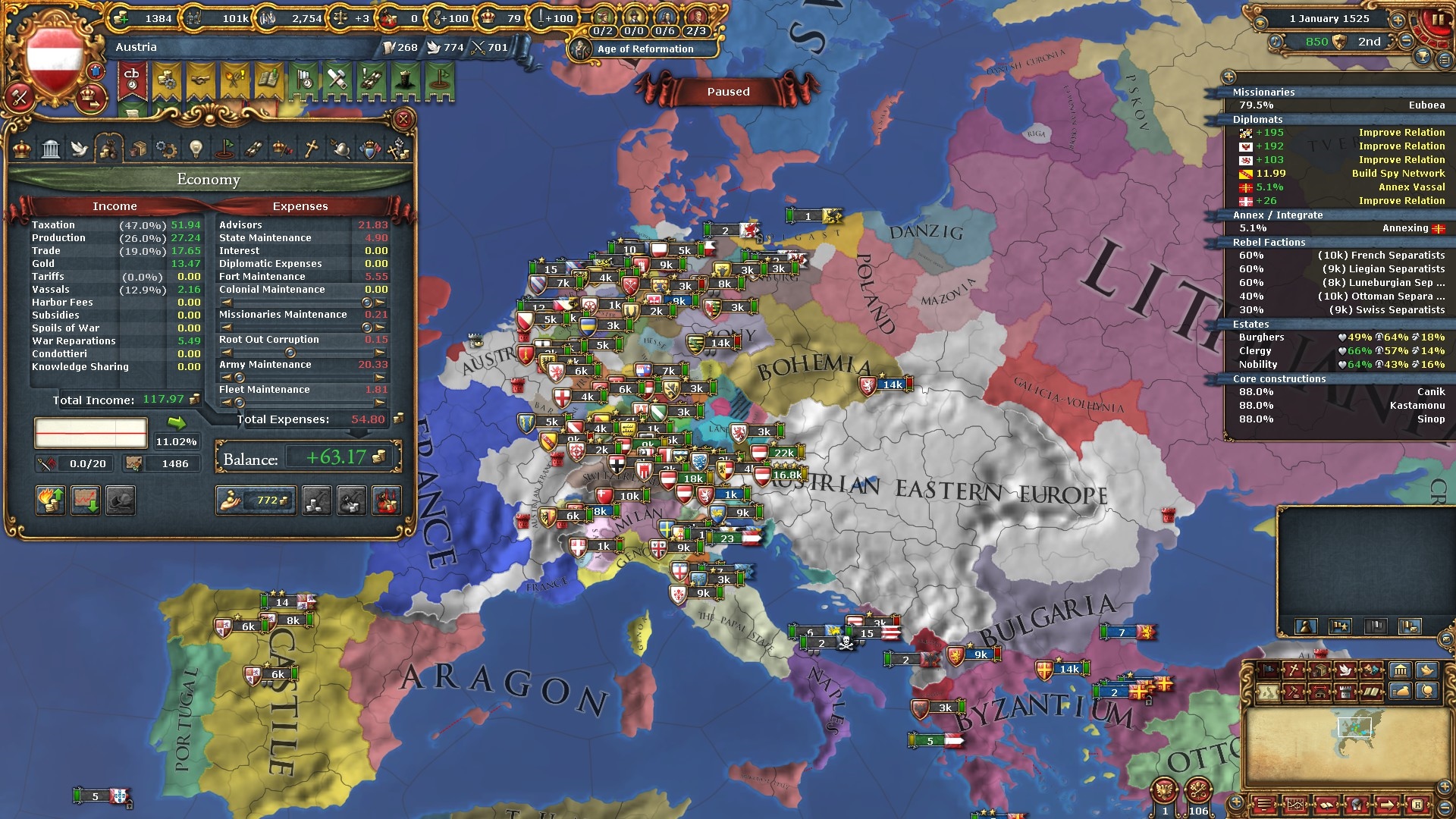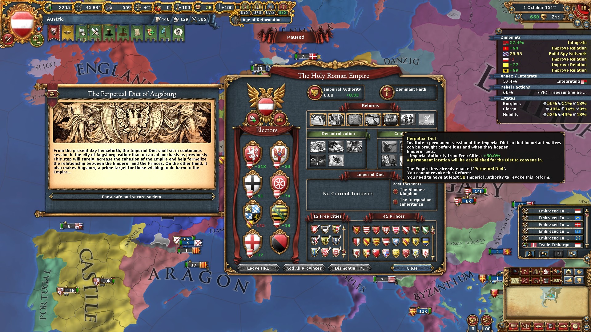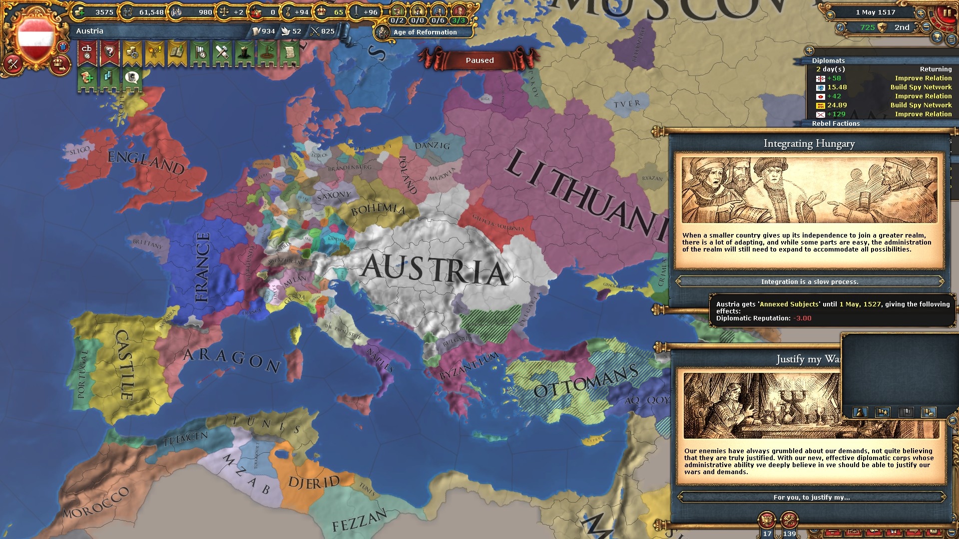 ミッション「ハプスブルク家の拡大(Spread the von Habsburgs)」報酬の外交併合コスト-20%を活用しています。