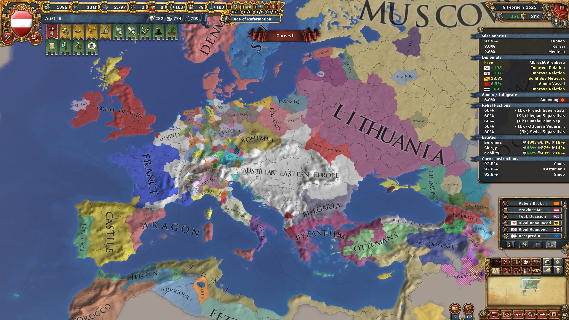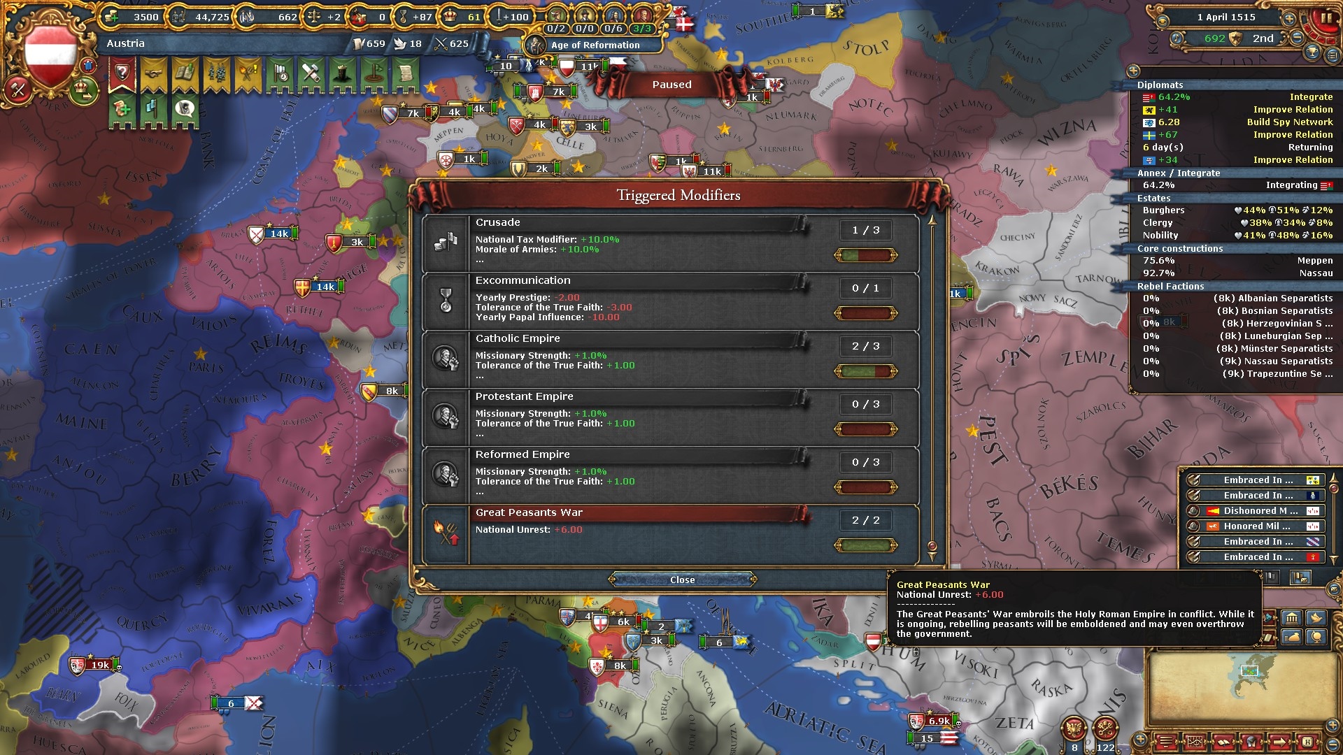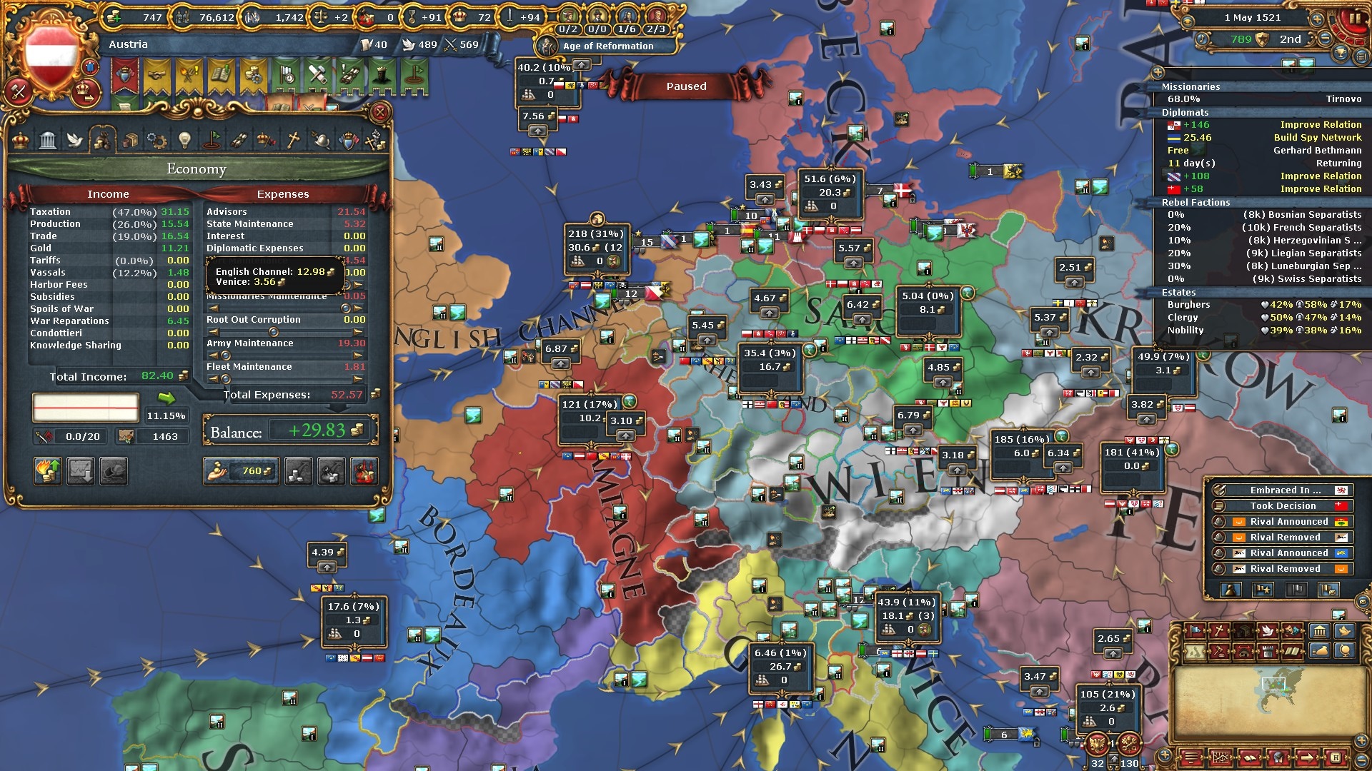 ミッション「ハプスブルク家の拡大(Spread the von Habsburgs)」報酬の外交併合コスト-20%を活用しています。