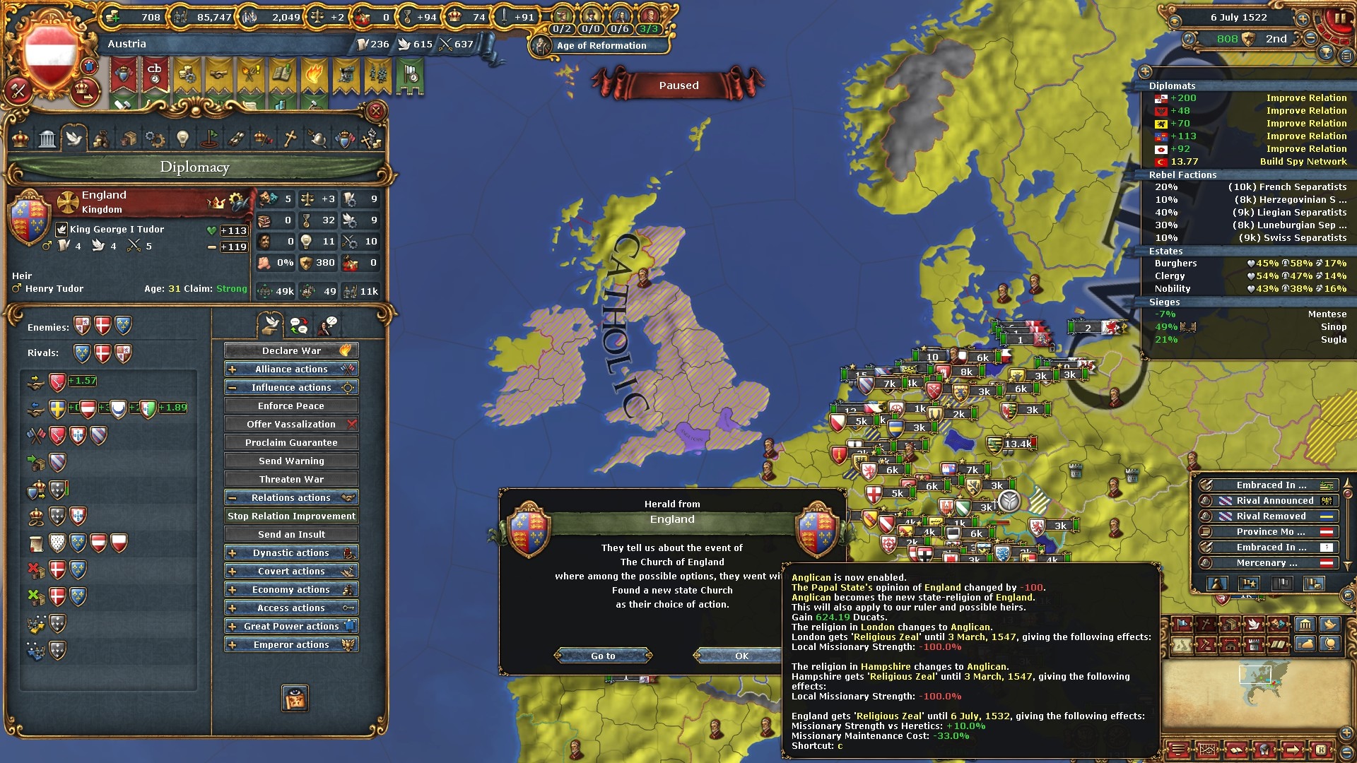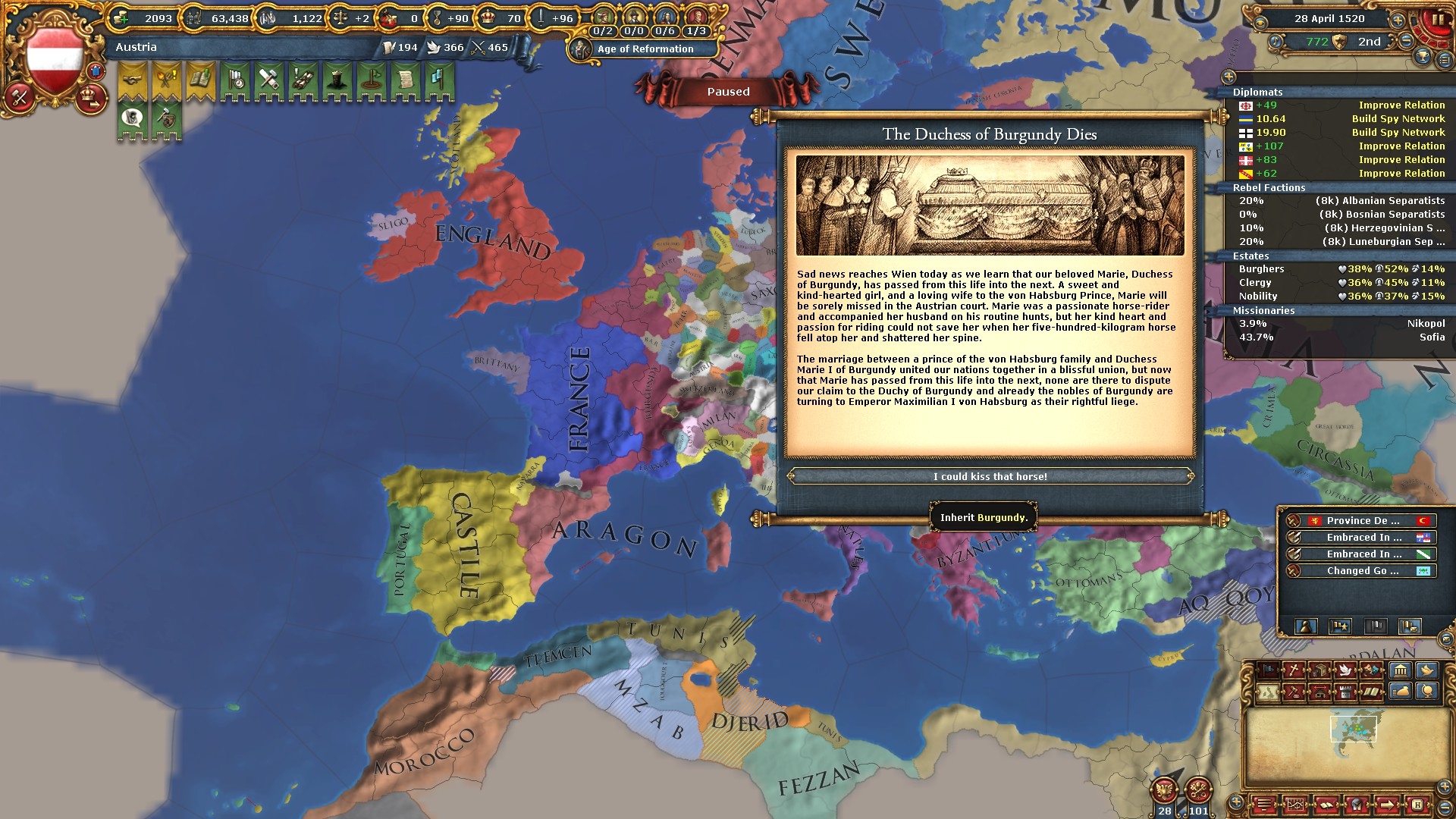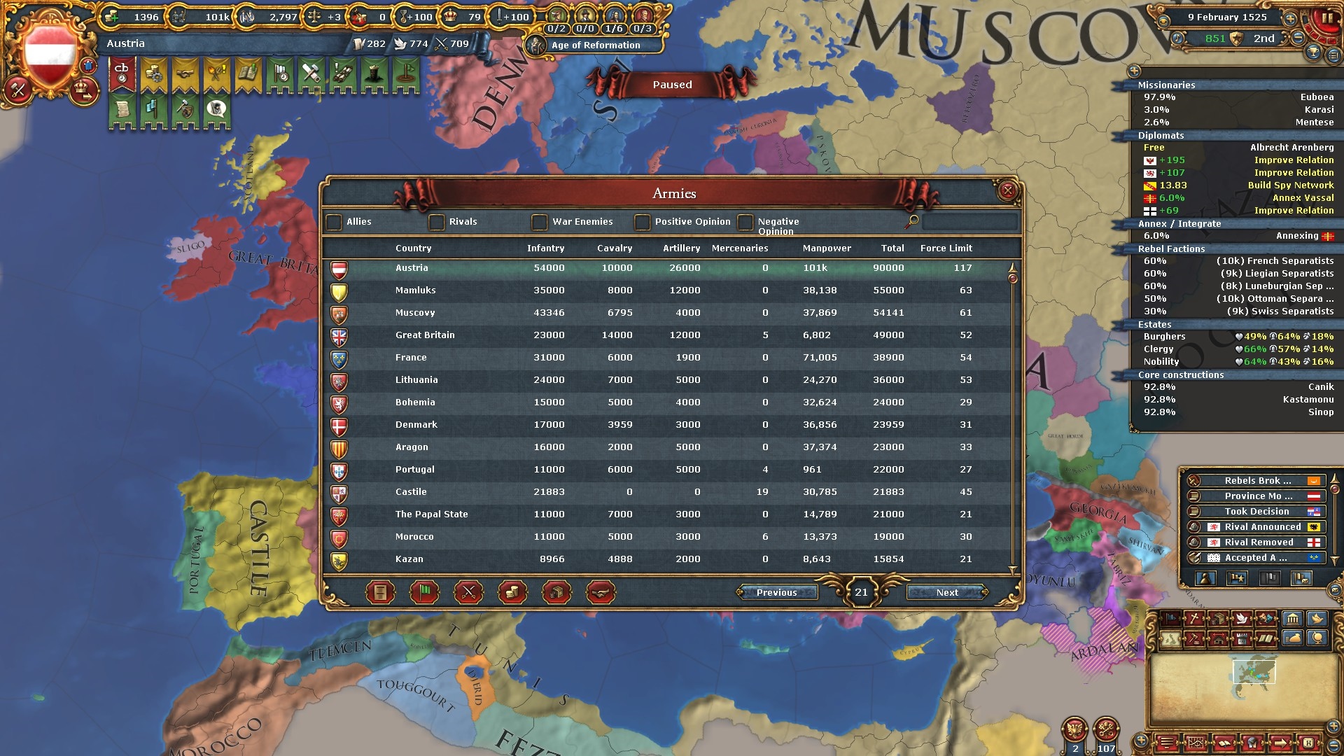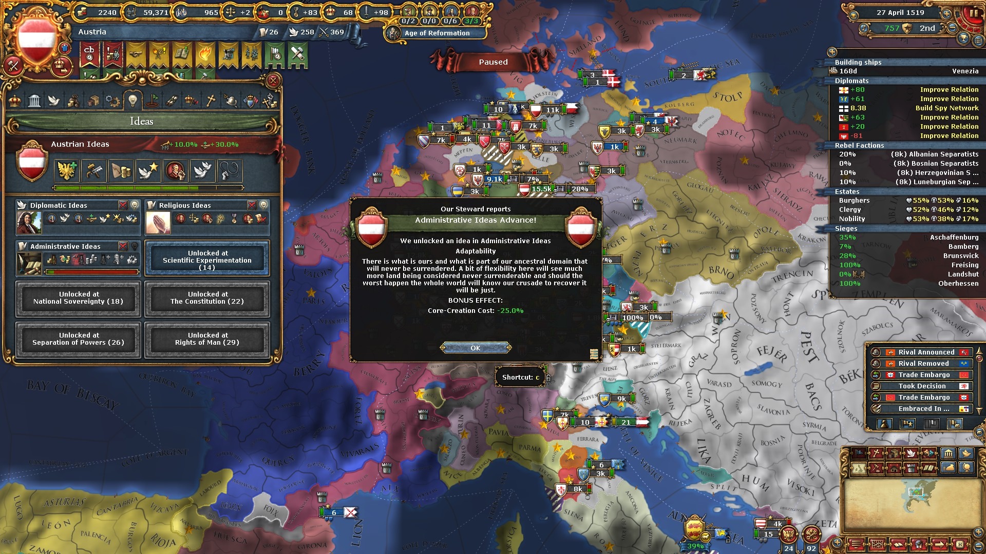 ミッション「ハプスブルク家の拡大(Spread the von Habsburgs)」報酬の外交併合コスト-20%を活用しています。