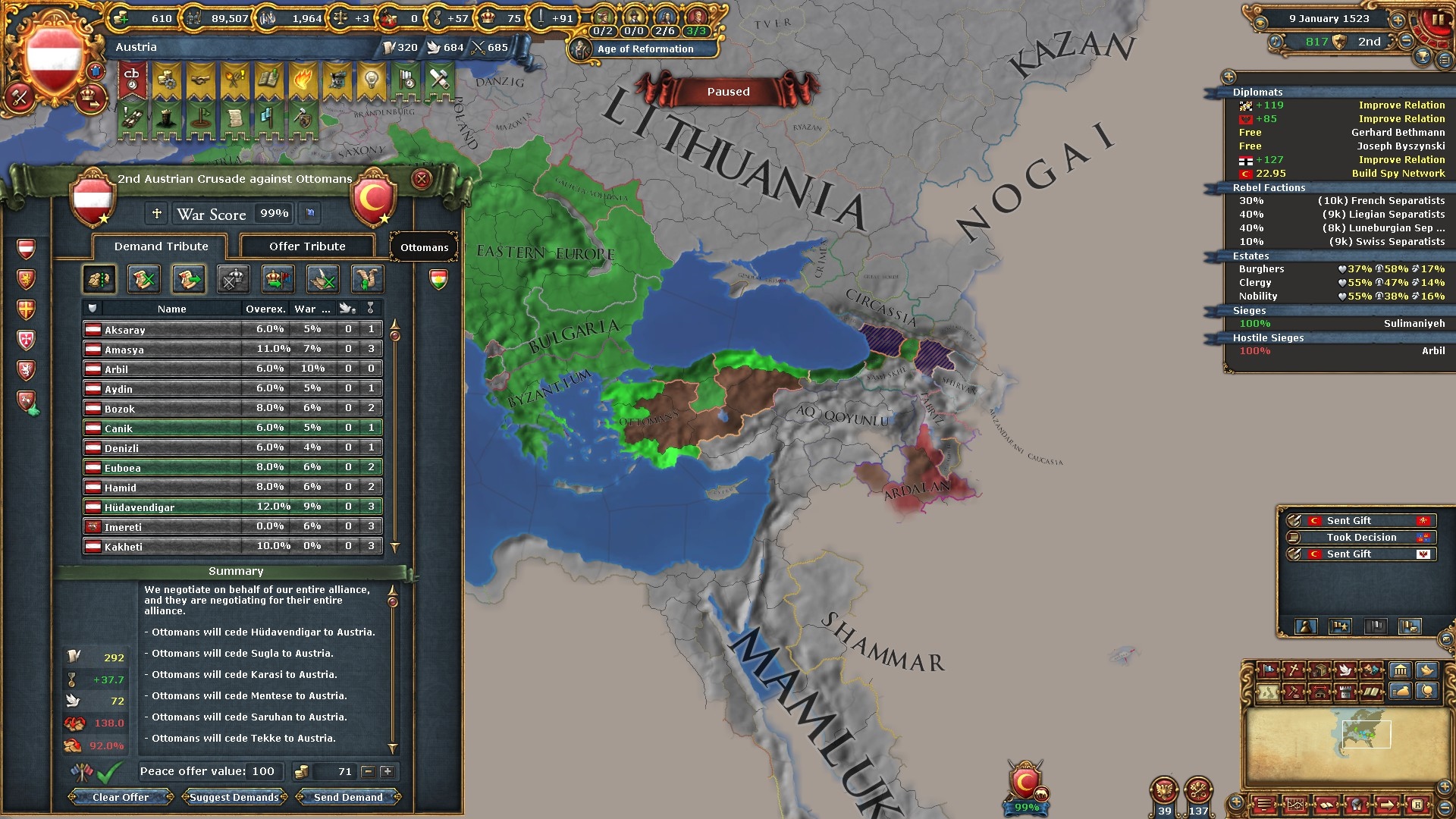 マゾフシェの解放と帝国権威をガッツリと稼がしてもらいました。