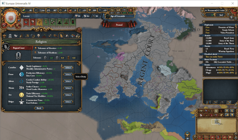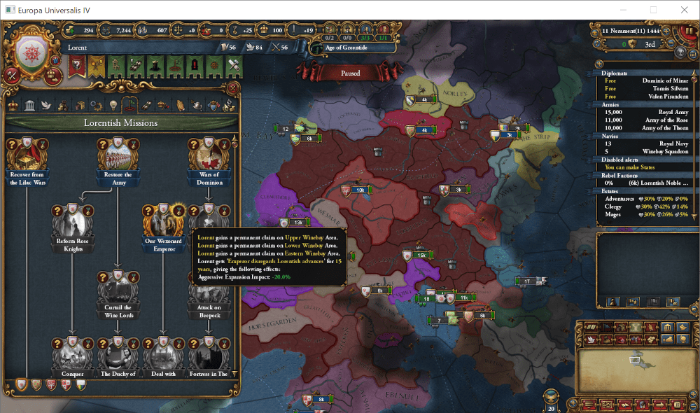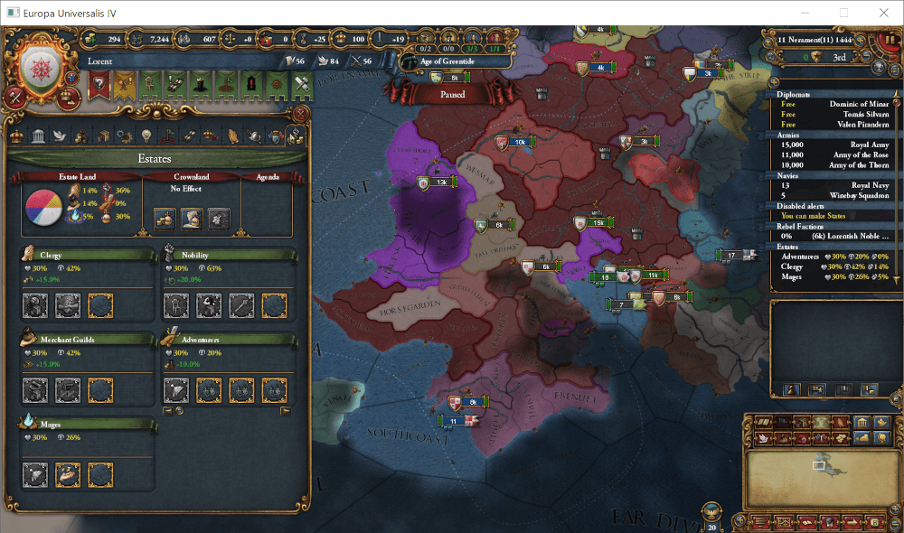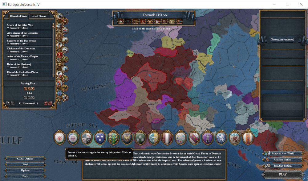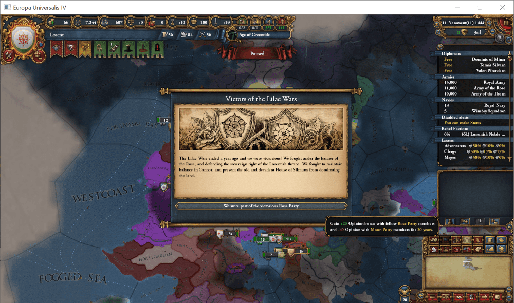 この国は523年に設立された非常に歴史の長い王国ですが、この100年間は苦難の時代でした。1348年にAnbennar帝国皇帝位をめぐる争いから始まった紫丁香花戦争(Lilac Wars)は第4次が集結する1443年にまで及び、参戦した各国に深い傷跡を残しました。最終的にLorent王国が率いる薔薇派(Rose Party)が勝利し、同盟国であるWex大公国が帝位を獲得したものの、戦争中に離反したLorent王国南部のワイン諸侯(Wine Lords)達は、未だに王国に従おうとはしません。