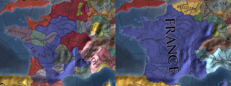 左がヴァニラ状態のフランス国内、右が本MODのフランス国内。